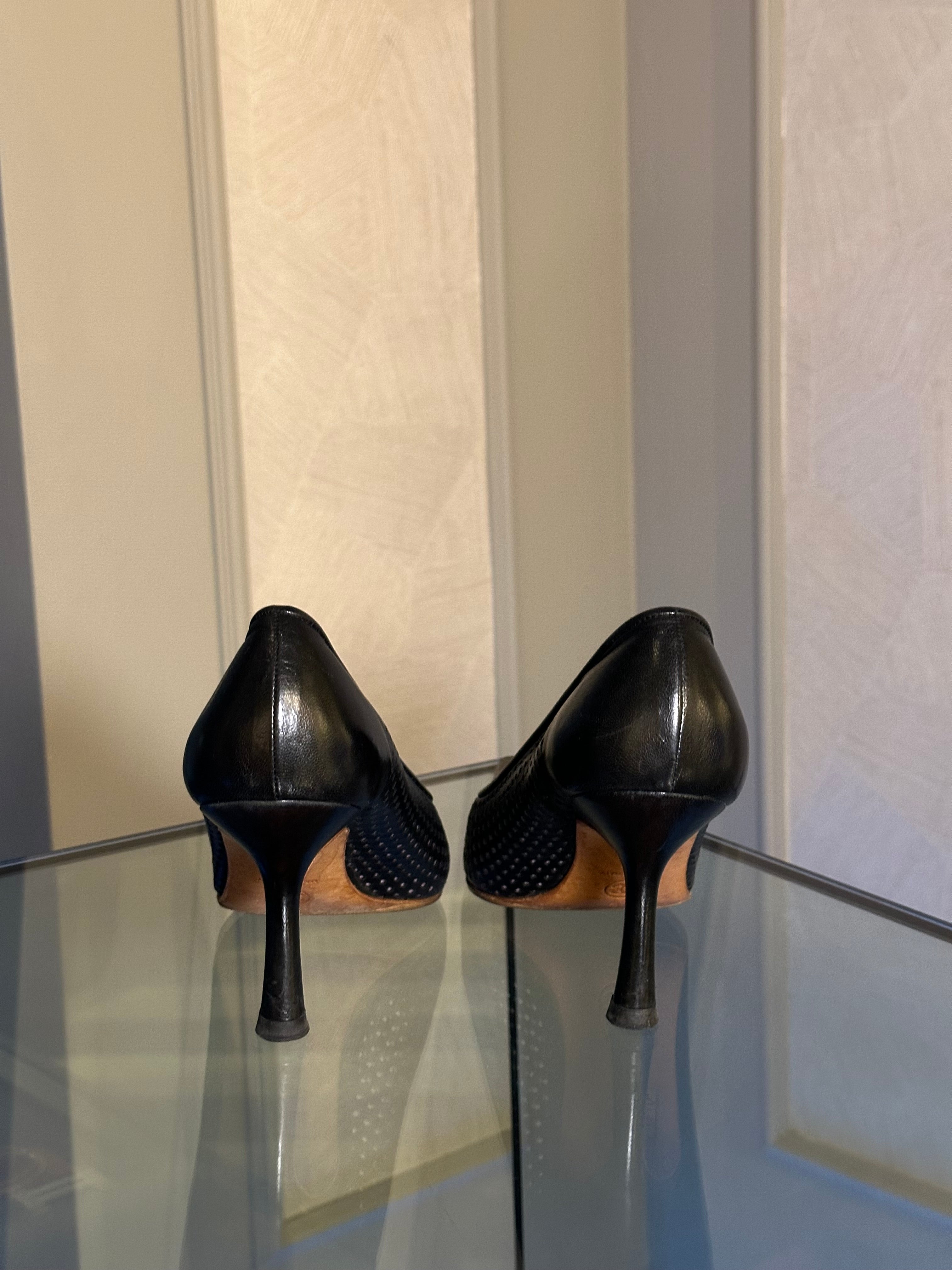 These sophisticated Chanel heels are crafted from high-quality black leather, featuring the brand’s signature elegance with a timeless silhouette.