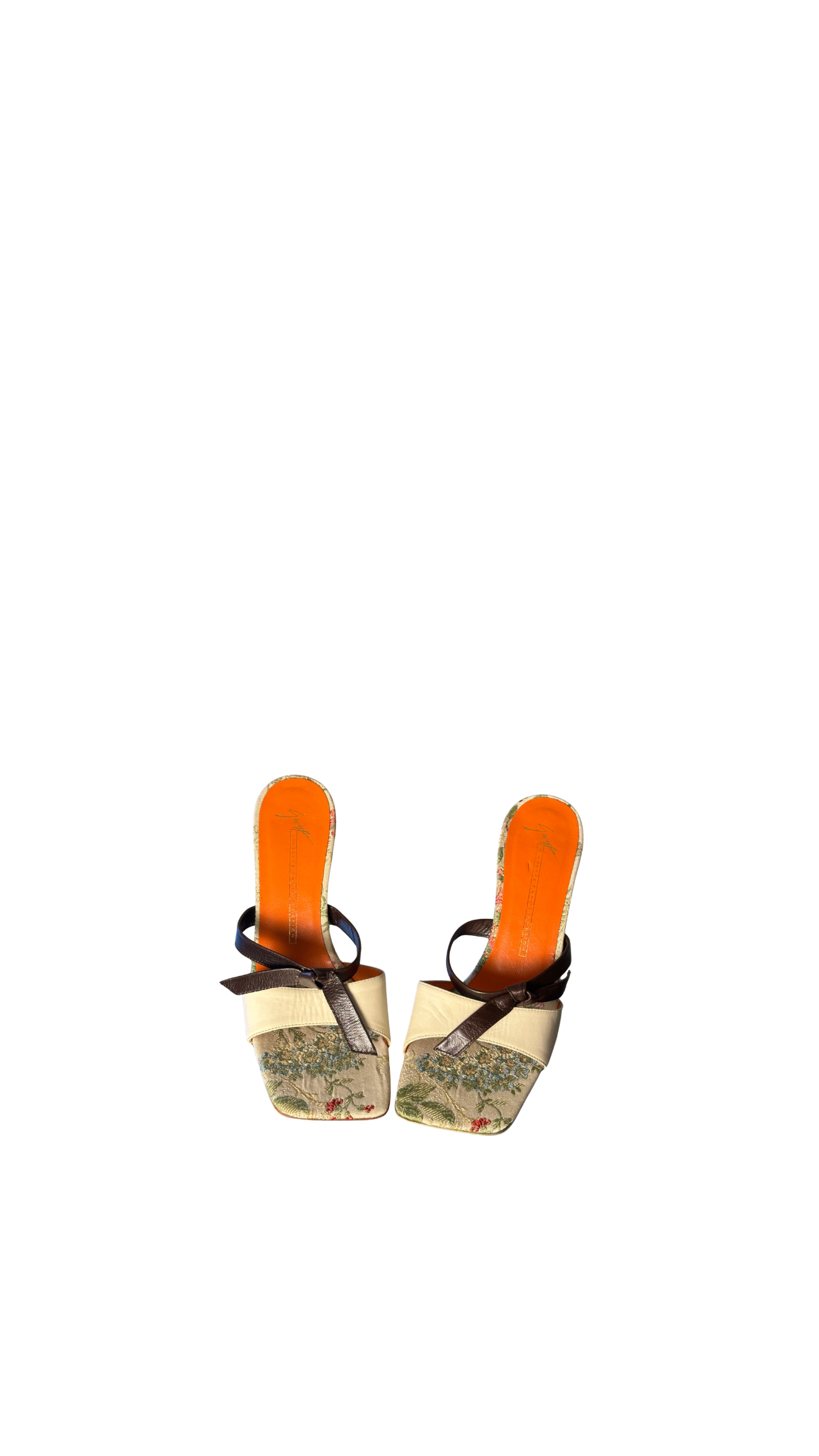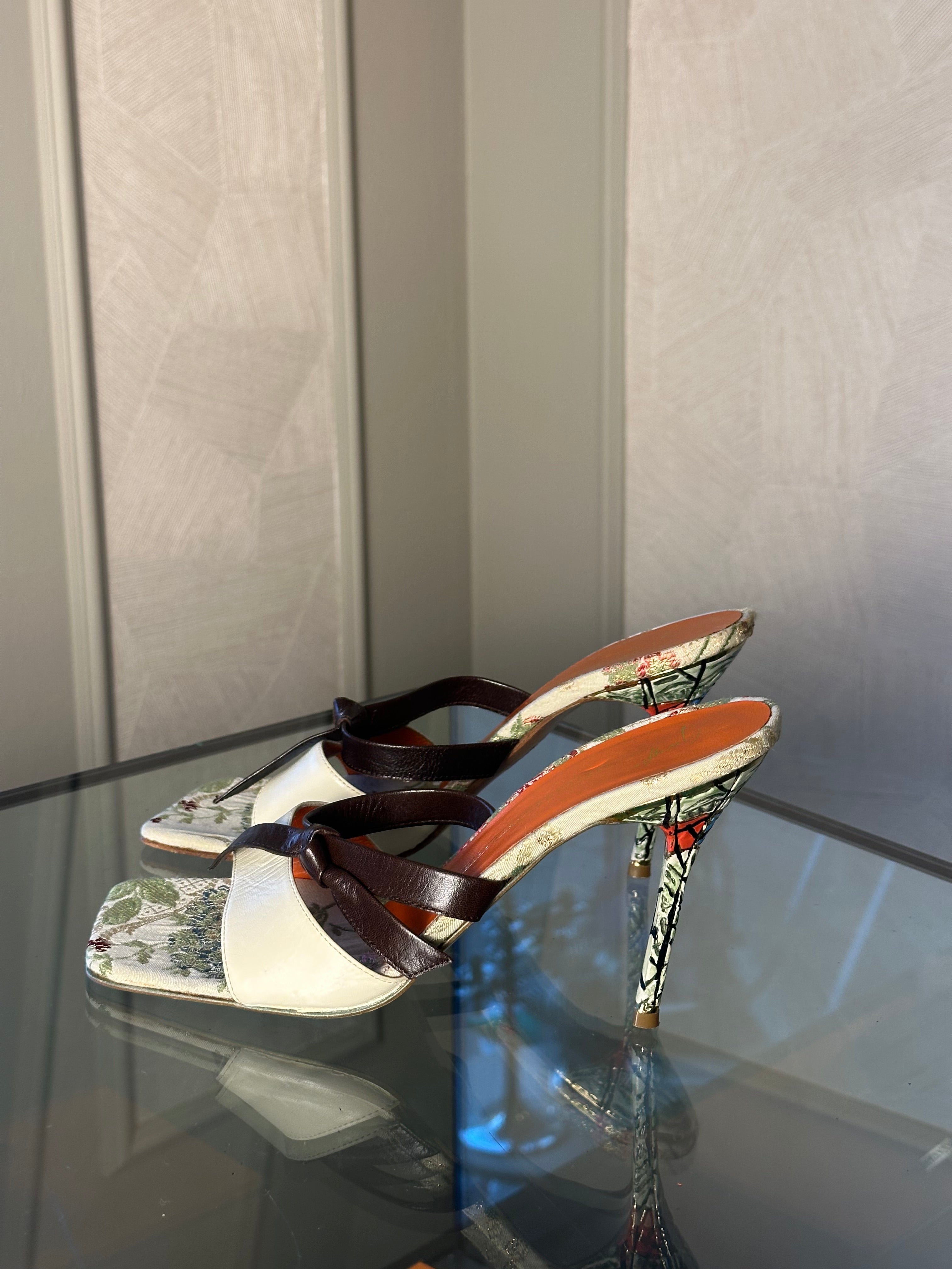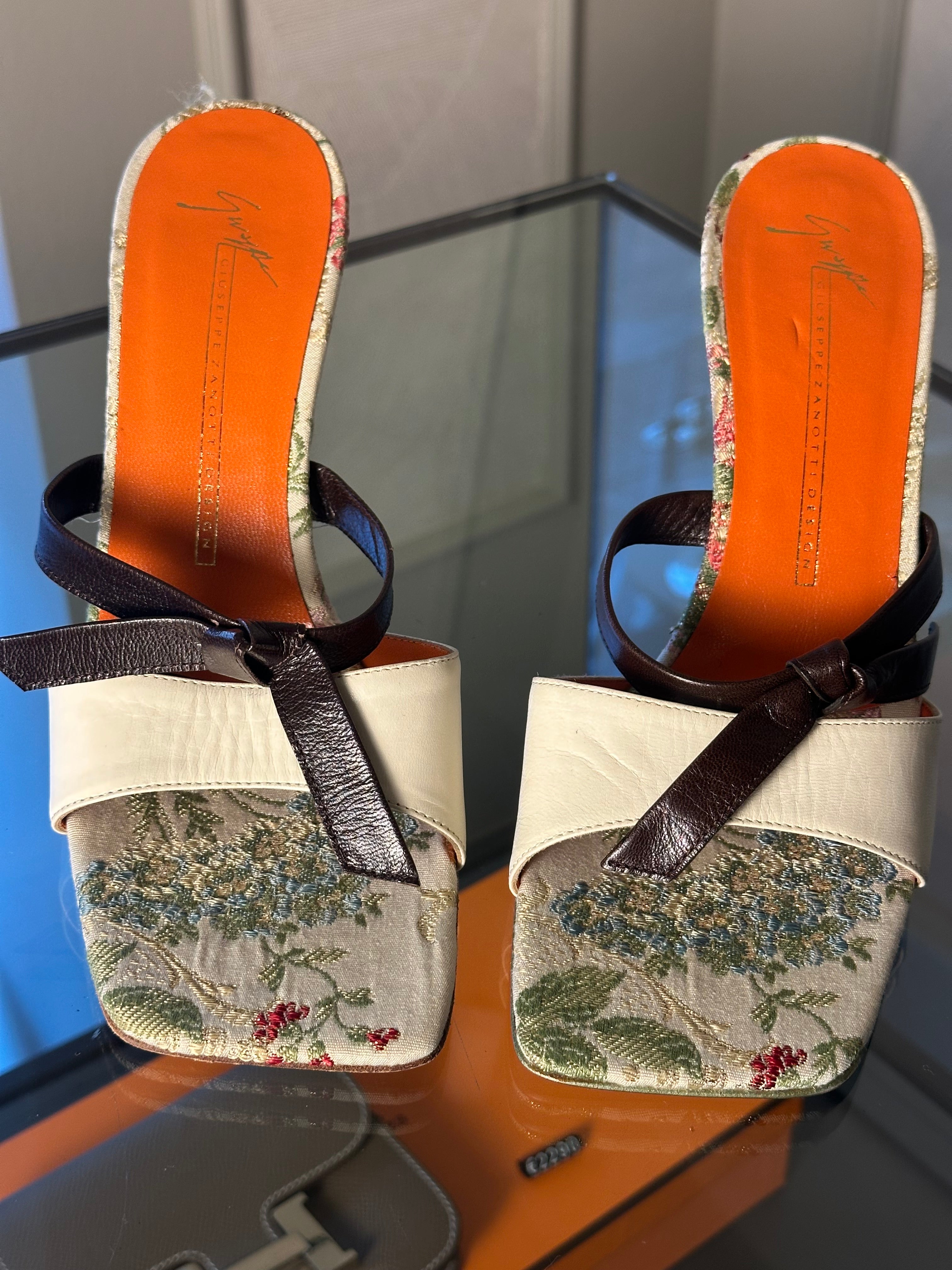 Giuseppe Zanotti decorative feminine kitten heels brown white leather toe strap floral