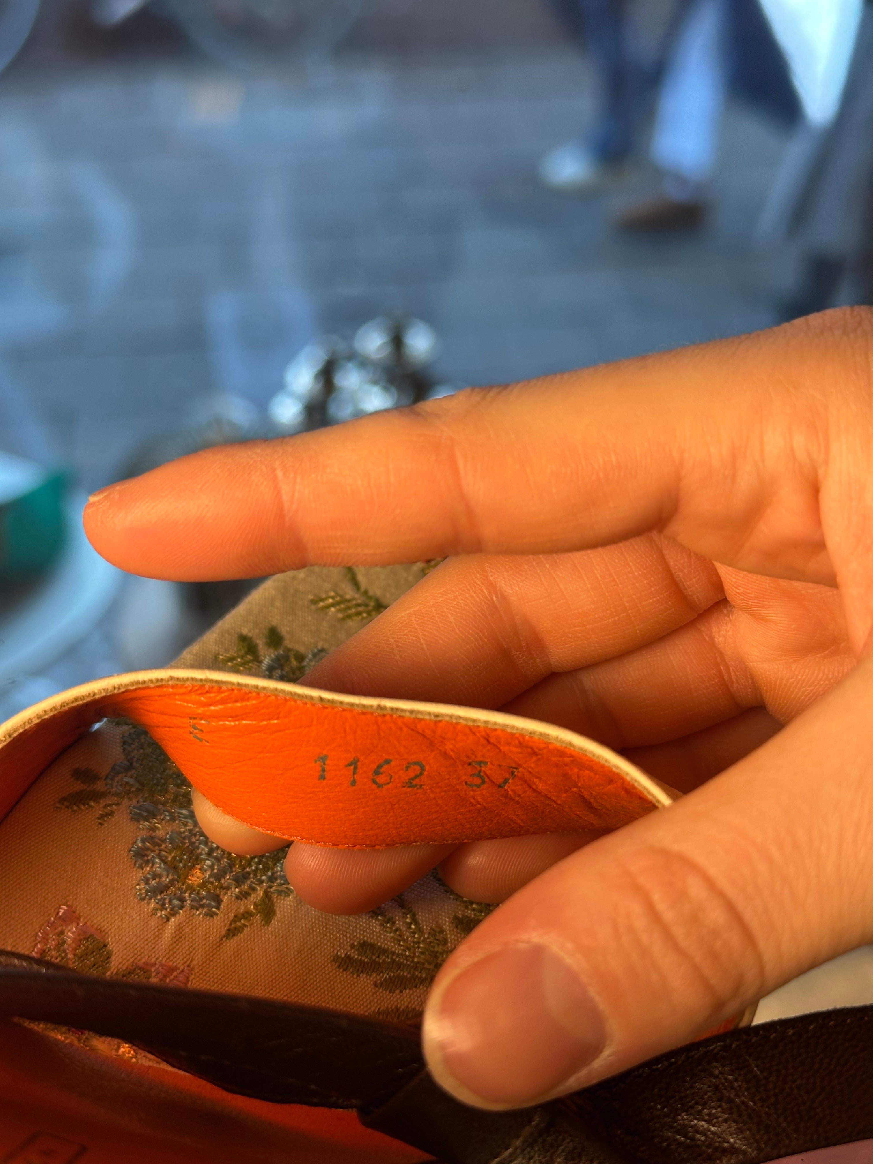large bow detail on either side strap. Slingback style & large white toe band holding shoe in place. orange insole. heel is handpainted with summery motifs. Soles are 2 different colours but this does not affect wear at all