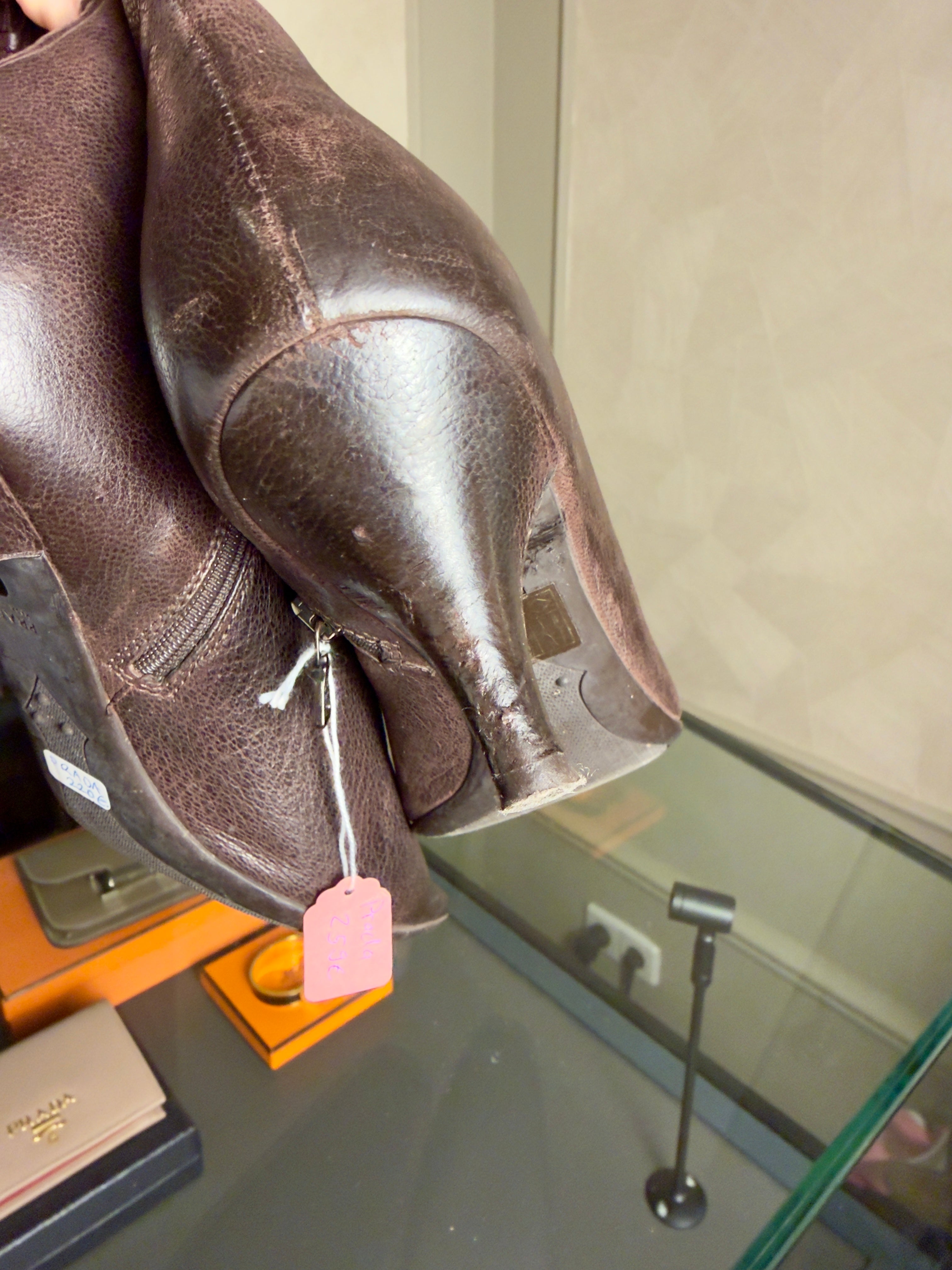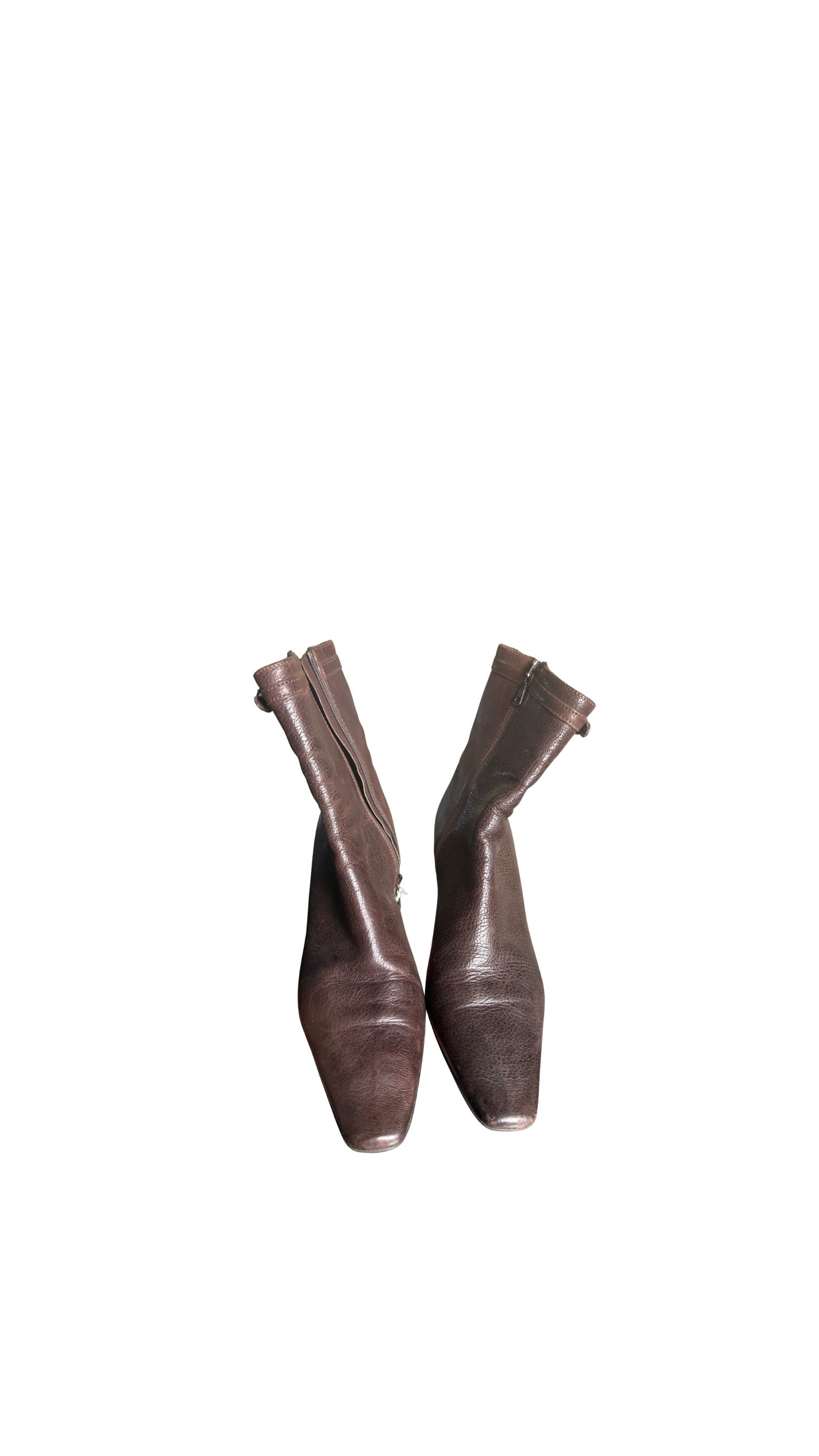 Prada Ankle Boots Booties kitten heel brown 90s gold buckle detailing pointed square toe worn leather