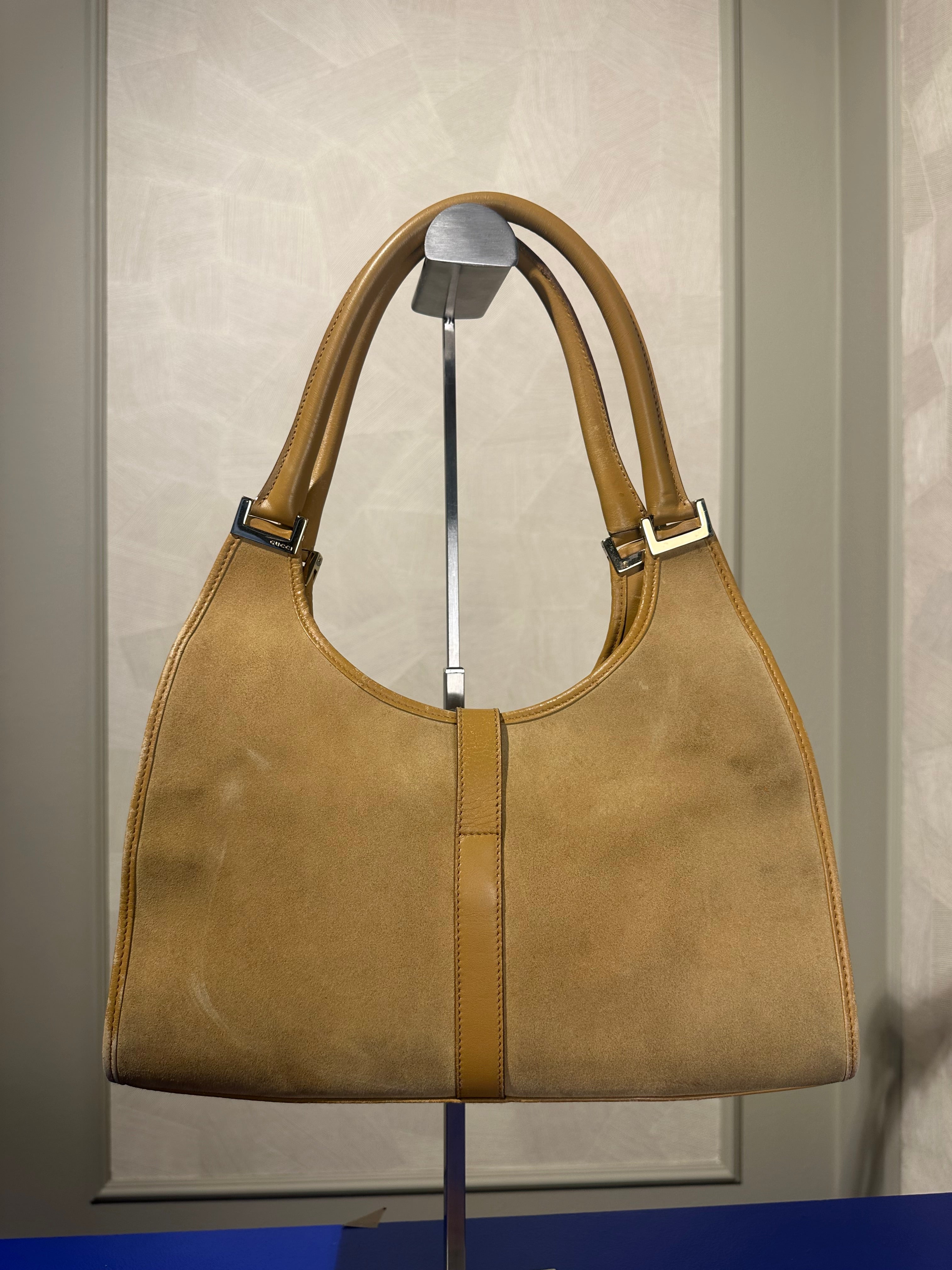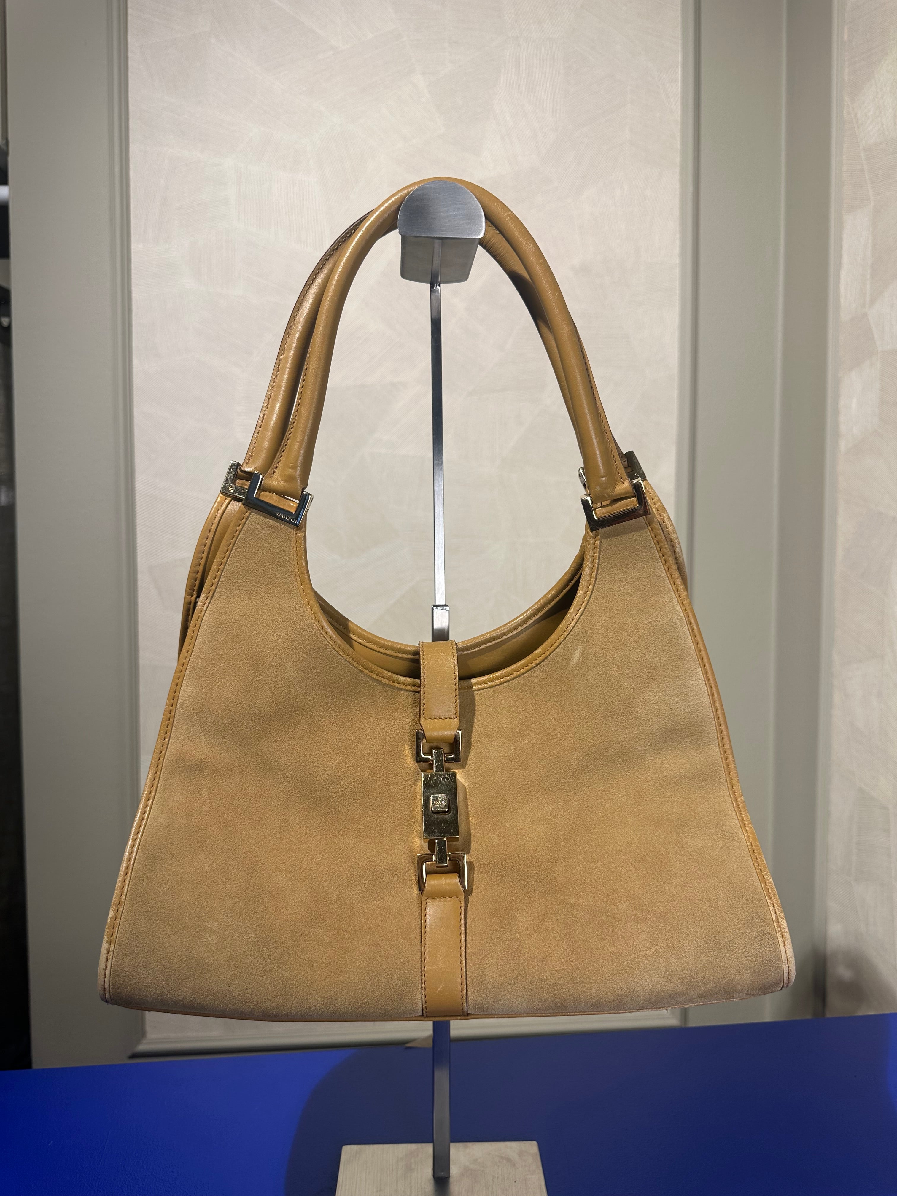 Gucci Jackie Beige Suede Shoulder Bag buckle detail monochrome vintage suede leather clasp detail chic 90s