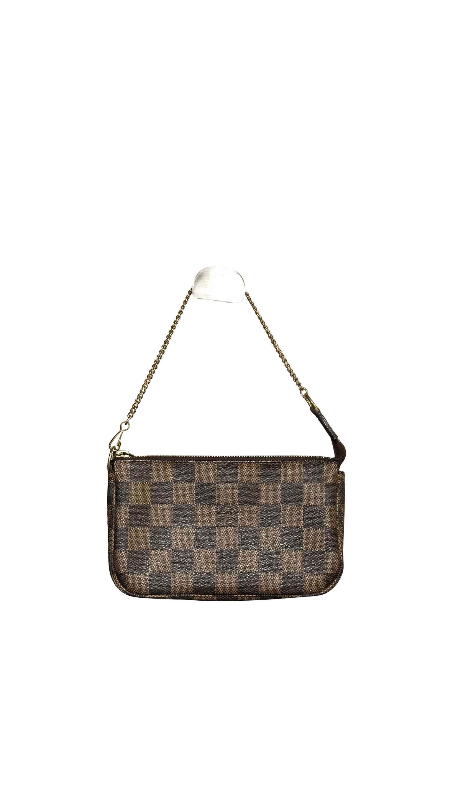 TSmall Louis Vuitton pochette in coated canvas, featuring the iconic monogram pattern and refined gold-toned chain strap.