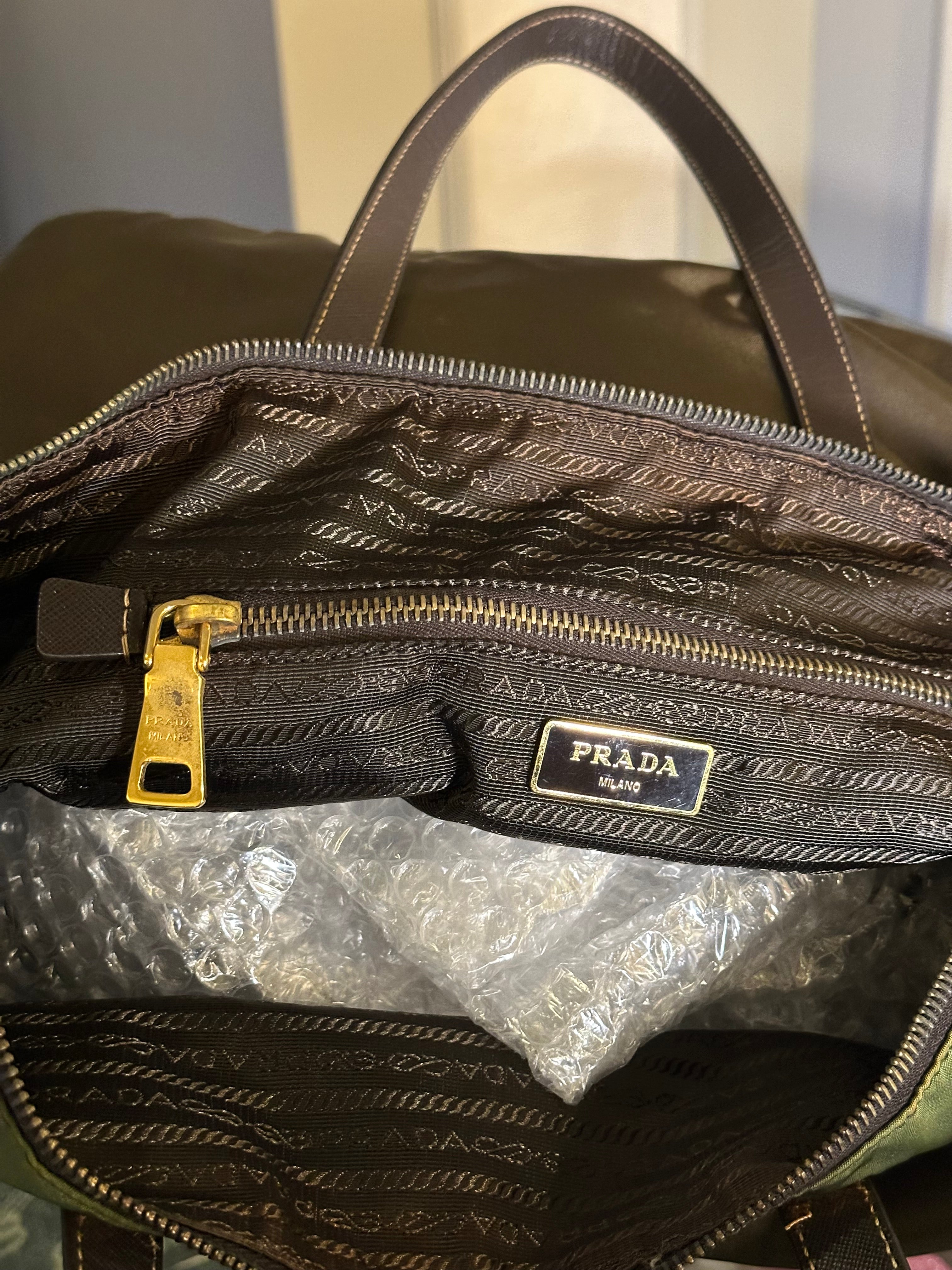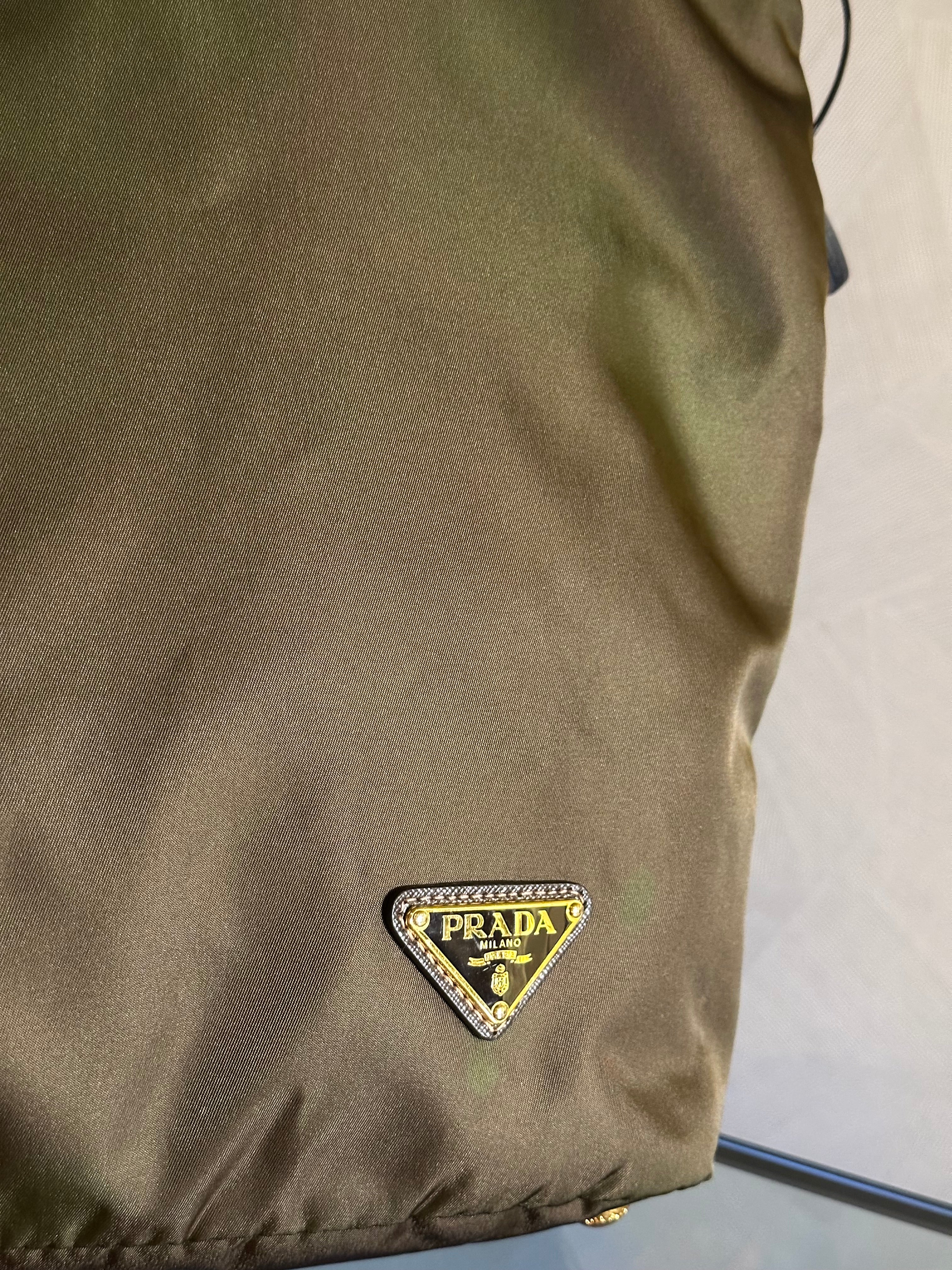 This stylish Prada shopper is crafted from high-quality green nylon with gold hardware.