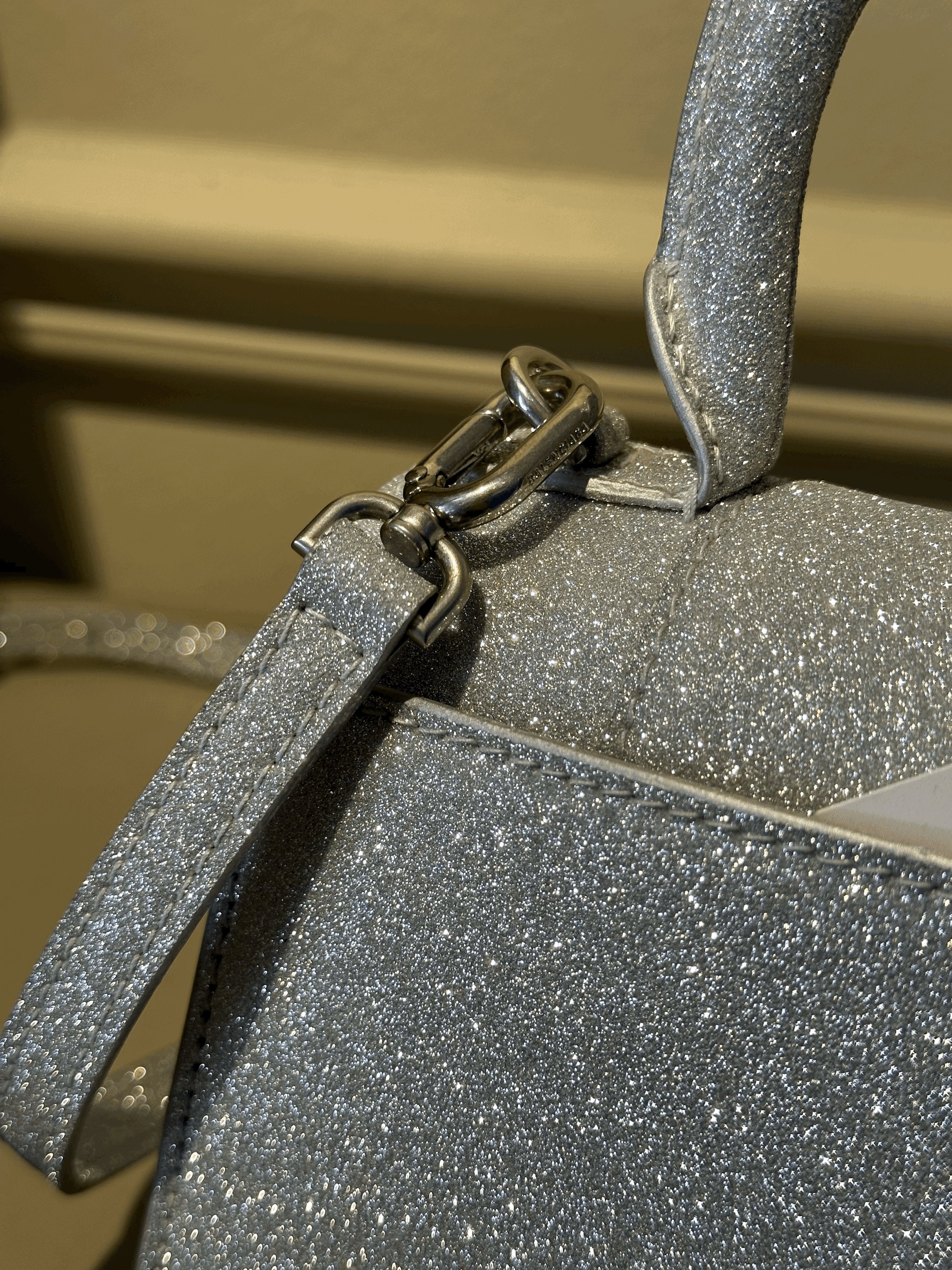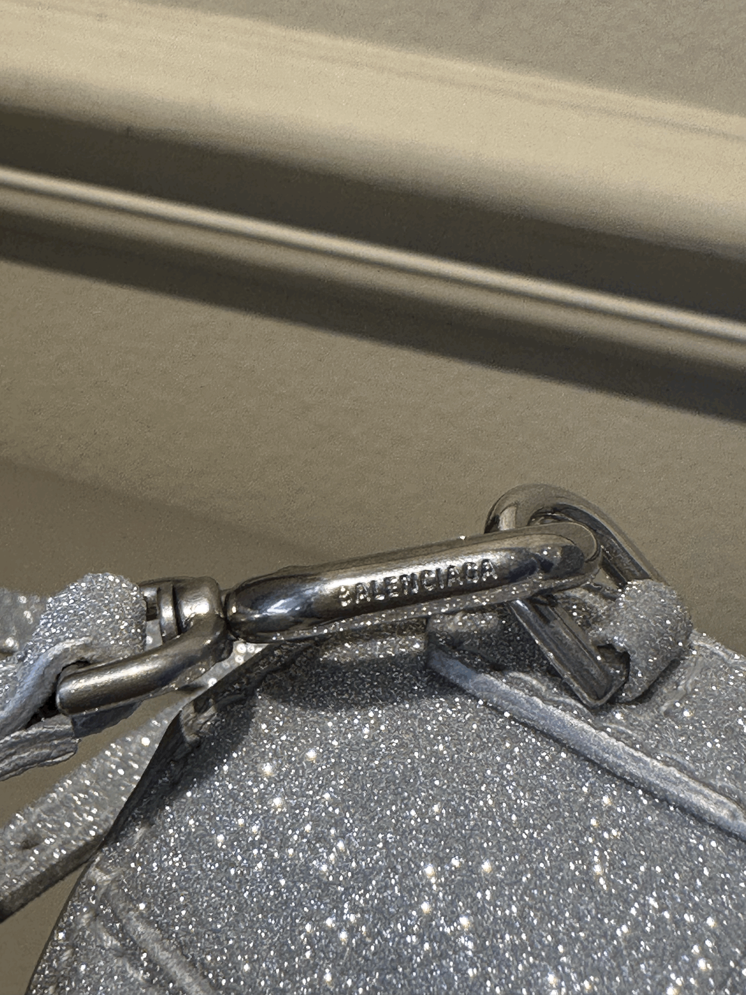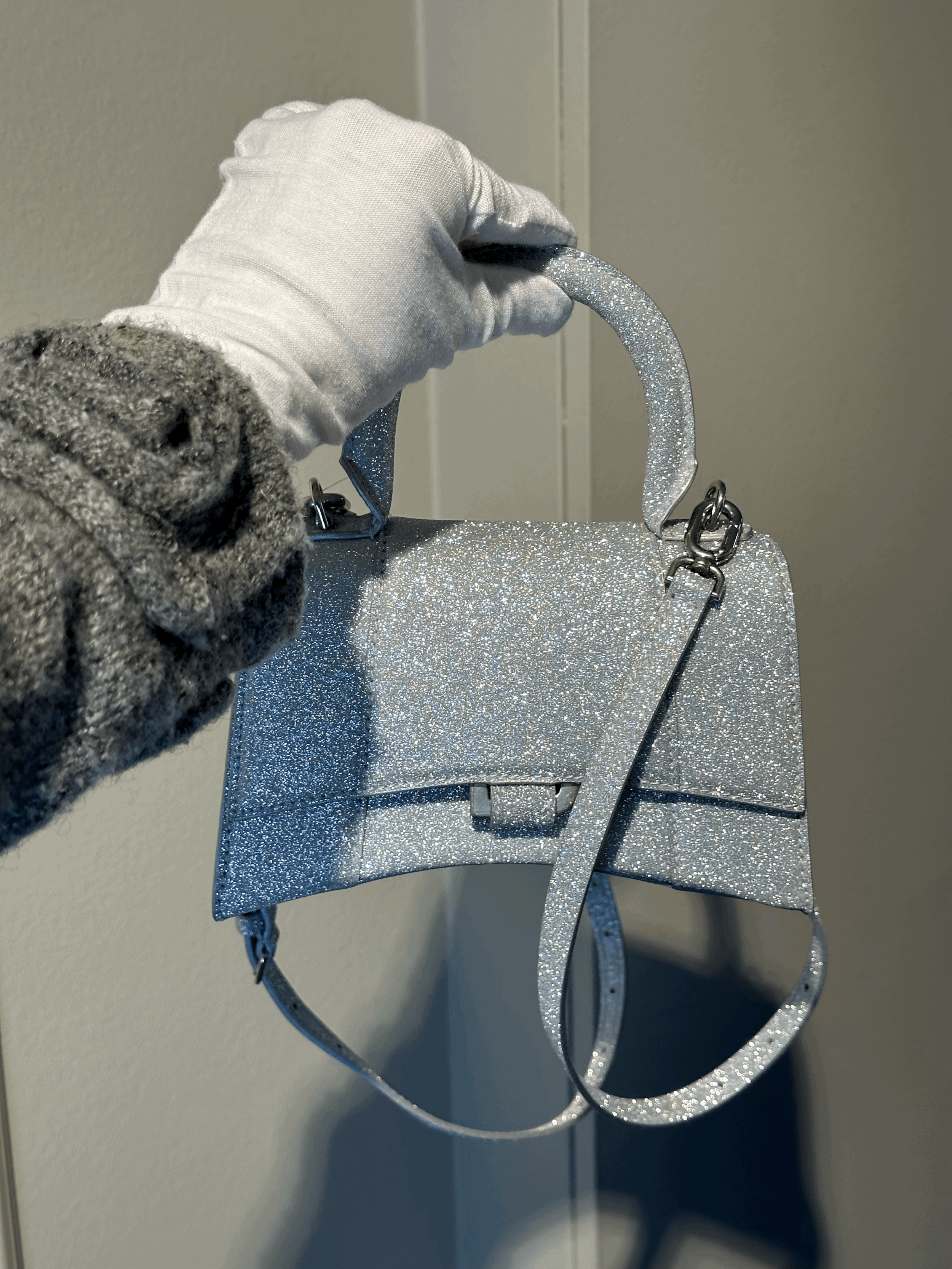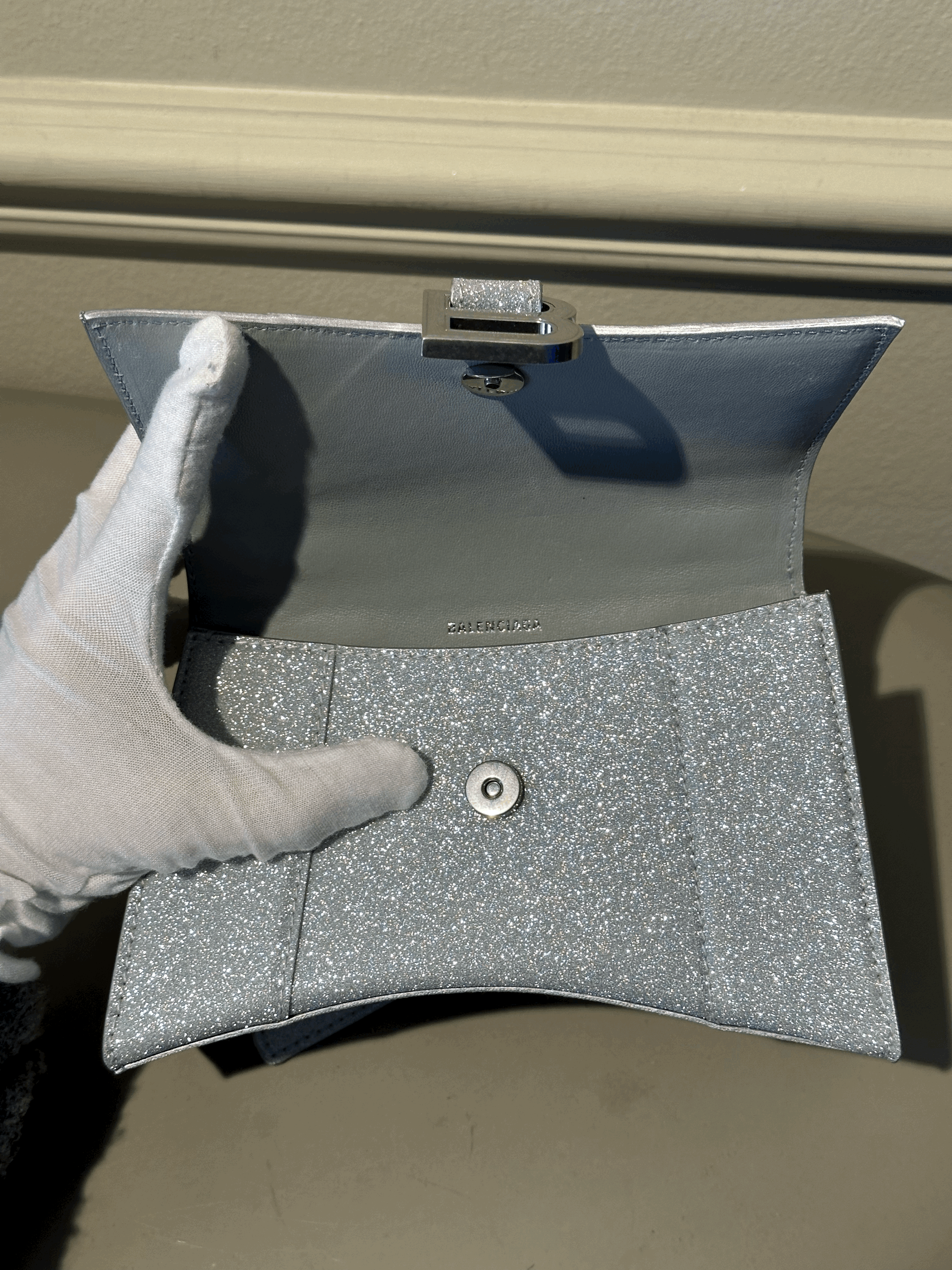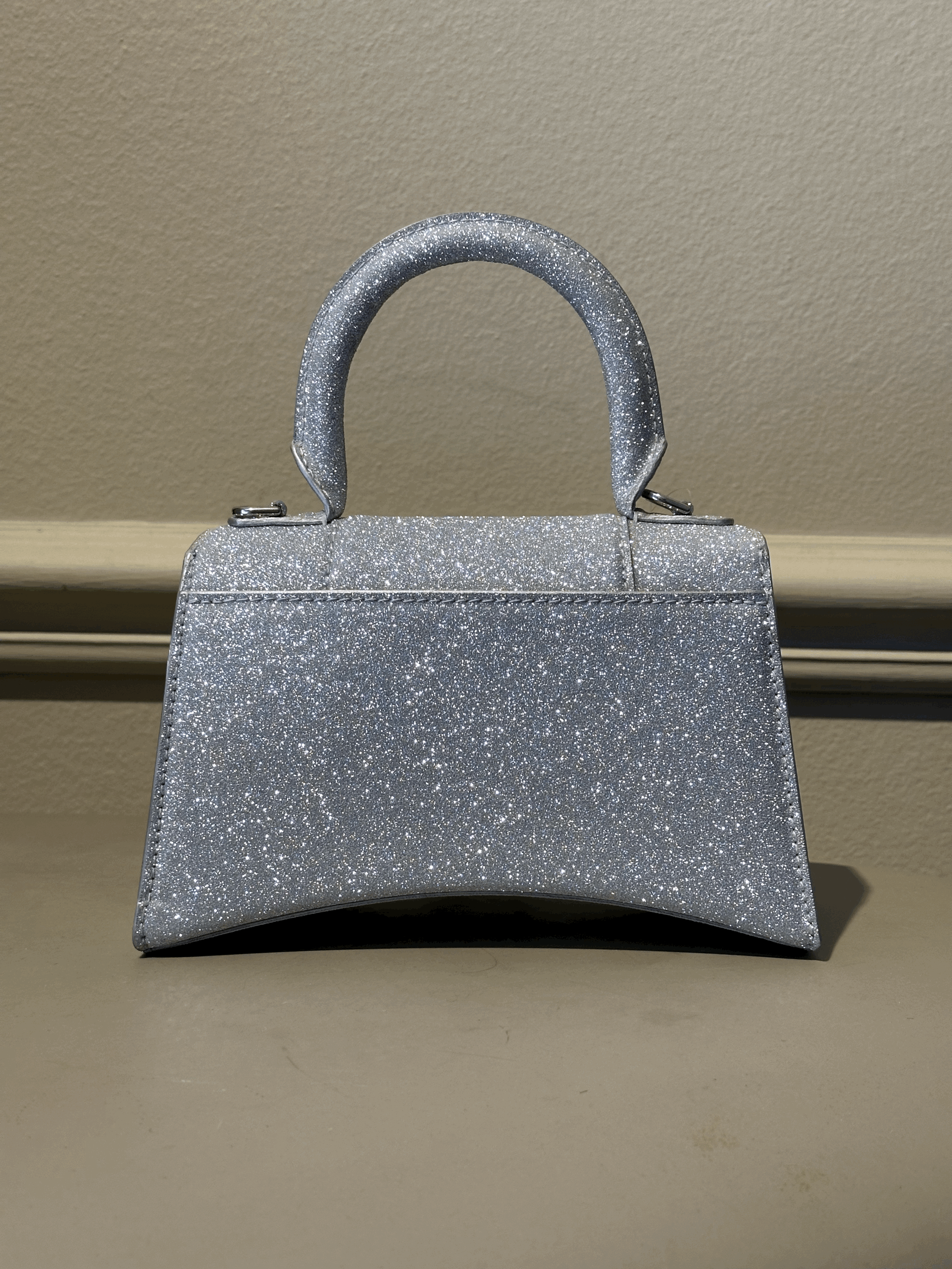 This new Balenciaga Hourglass bag features the brand's iconic curved structure with a sculptural silhouette, crafted in a silver glitter fabric that adds a striking and modern edge. The structured design is finished with the signature B-logo hardware on the front flap and includes a single top handle along with a removable shoulder strap (not pictured, if applicable). With its standout finish and bold lines, this top handle bag is ideal for elevating an evening look or adding statement contrast to minimal outfits.