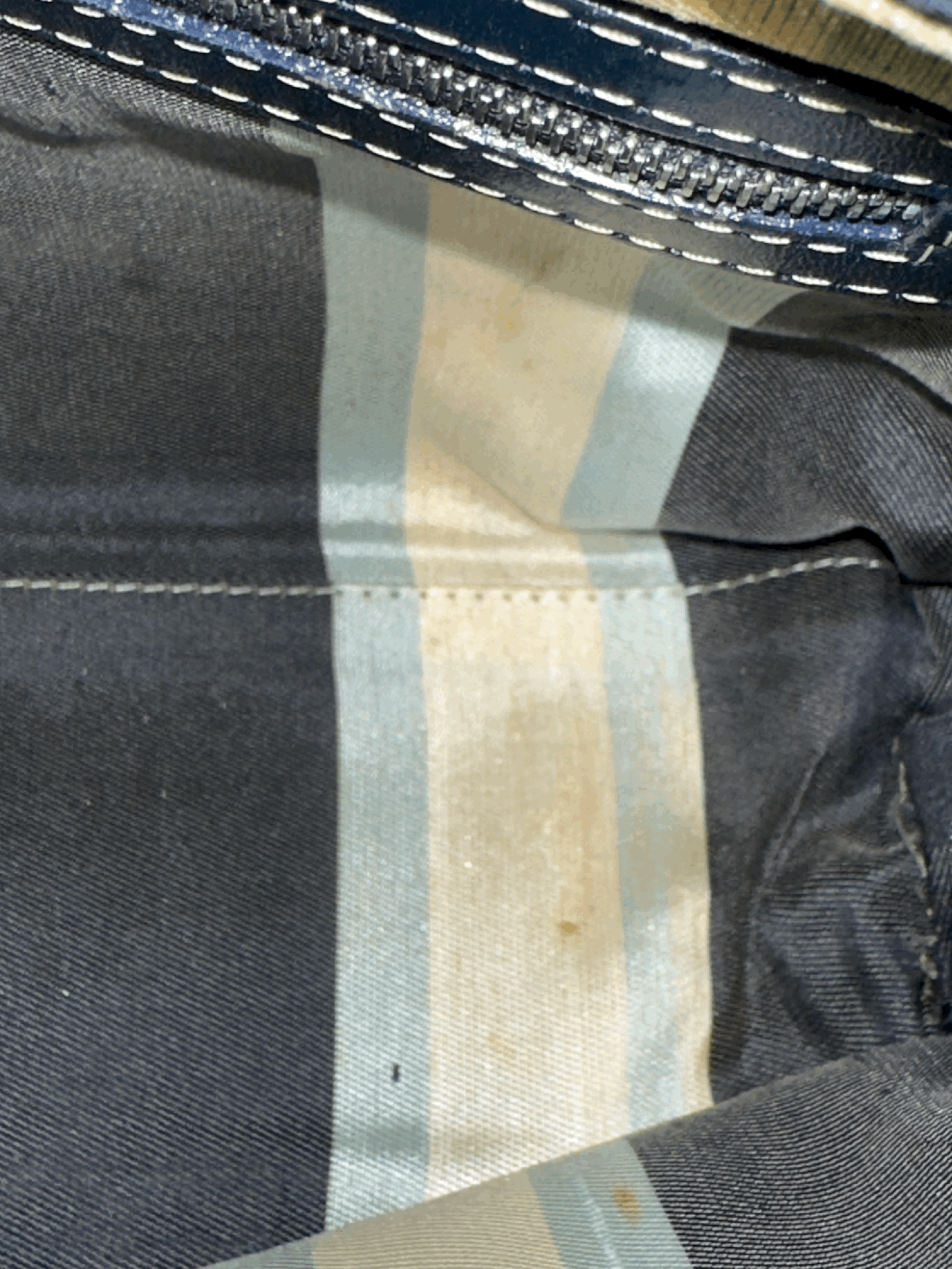 The exterior shows light rubbing and minor surface stains. The shoulder straps display rubbing and partial cracking, and the metal fittings have scratches from wear. Please refer to the photos for a detailed view of its current condition.