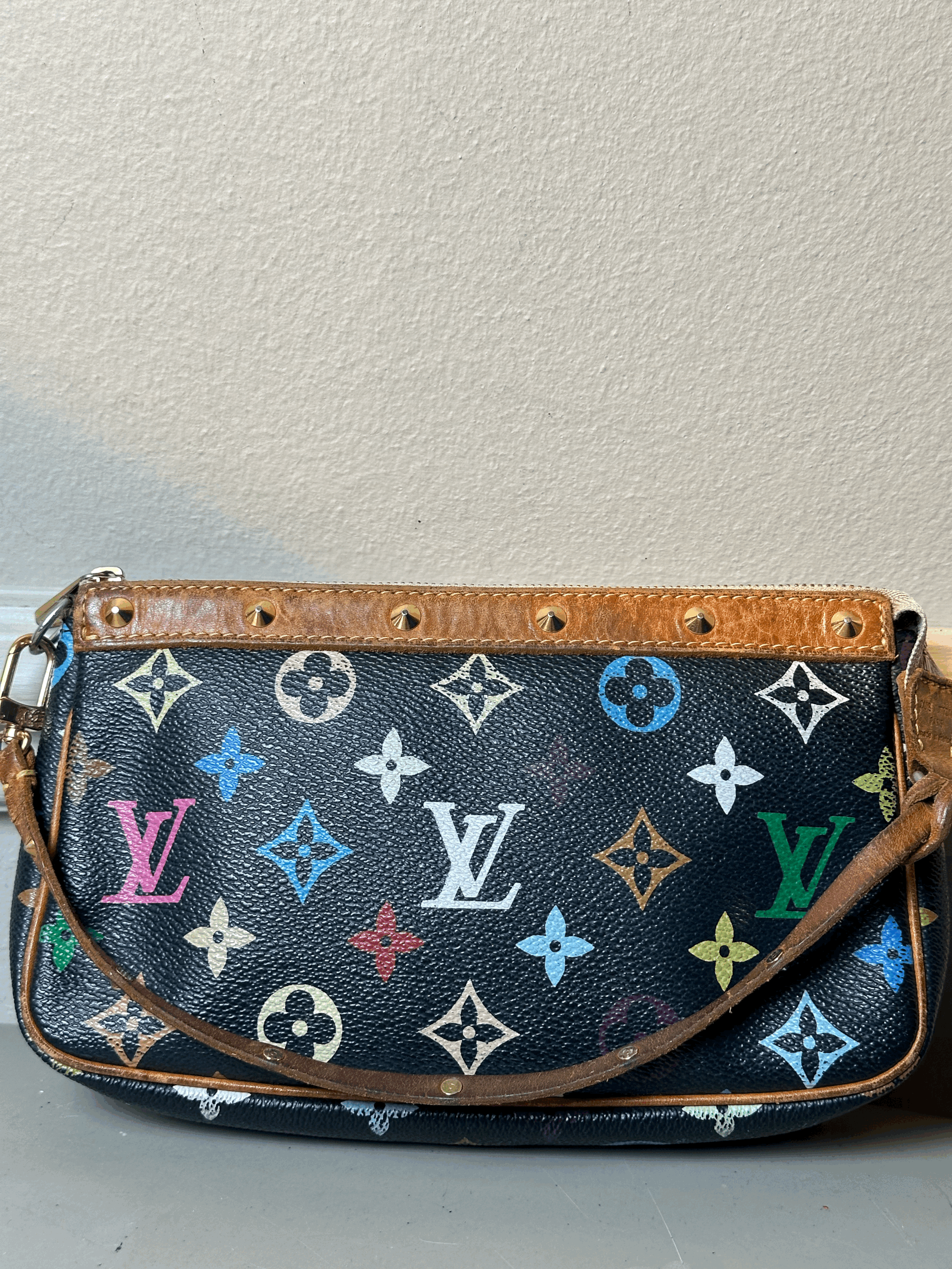 A bold and coveted design from Louis Vuitton’s Multicolor collection. Created in collaboration with Japanese artist Takashi Murakami, the bag features a vibrant color monogram print on a black background, paired with natural vachetta leather trim and gold-tone hardware.