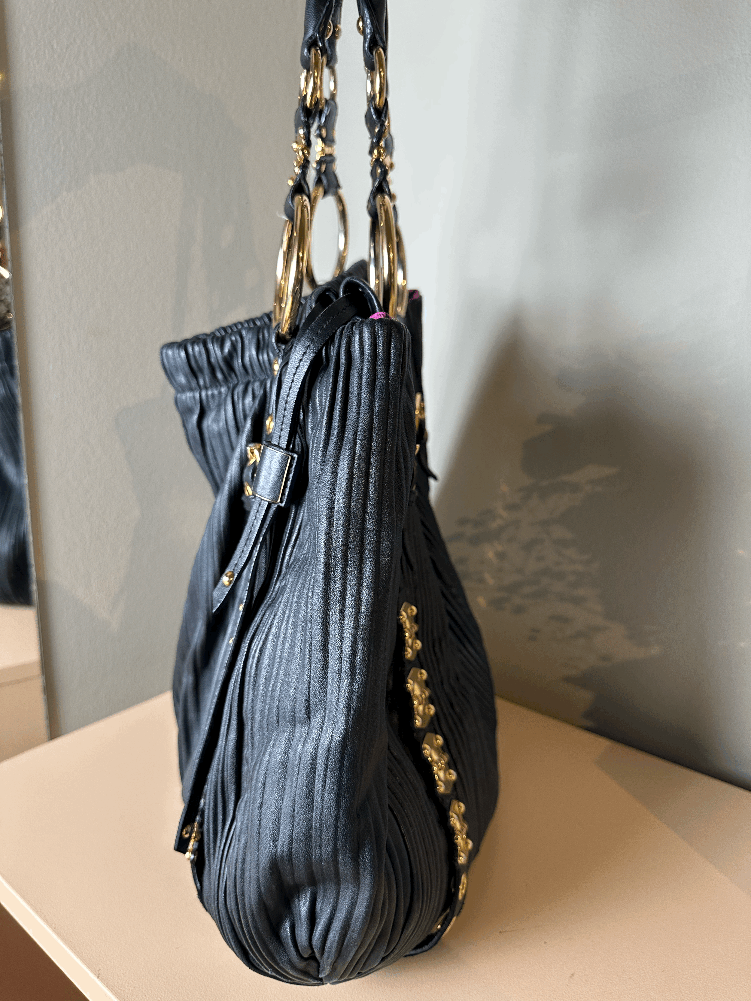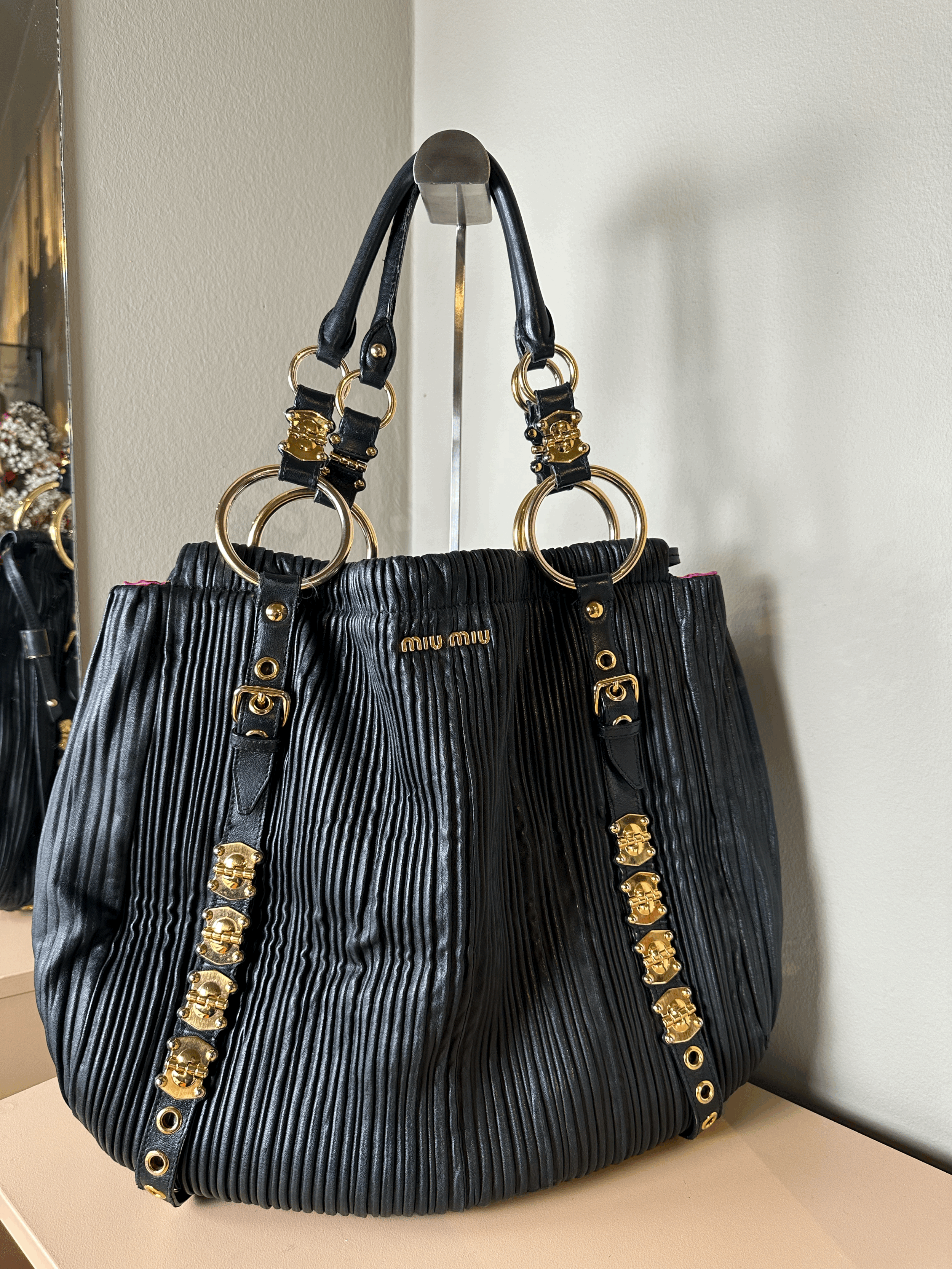 At Fashionfouvintage, we take pride in offering standout pieces with strong design DNA, like this embellished Miu Miu tote. Please note this pre-owned item is used and may have minor imperfections consistent with wear and age.