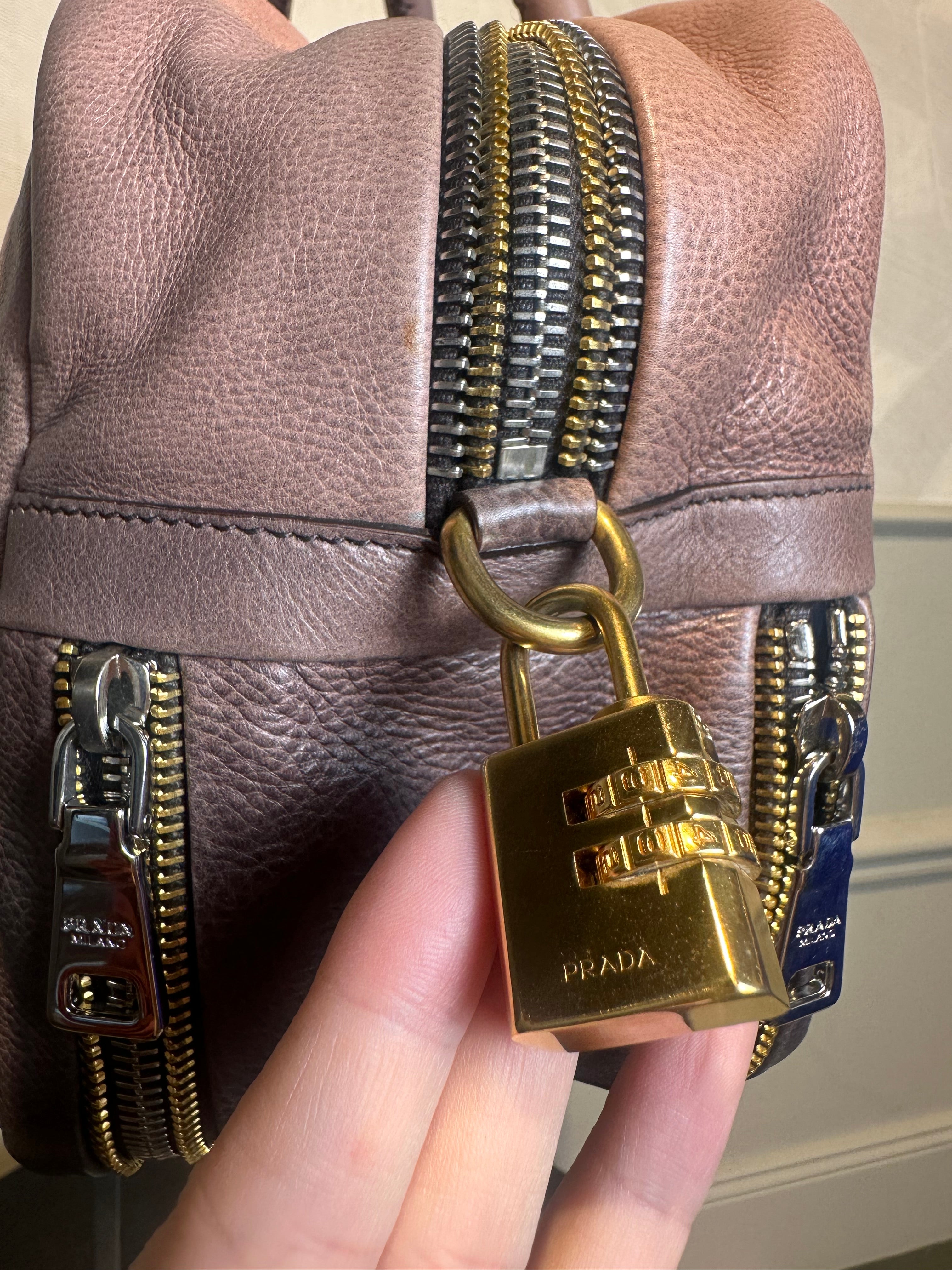 Prada Ombre Brown Glace Leather Zippers Bauletto Bag Large Lock Plate Zippers Glace Satchel Prada AW 2007 archival Bag pink purple Leather bowling bag