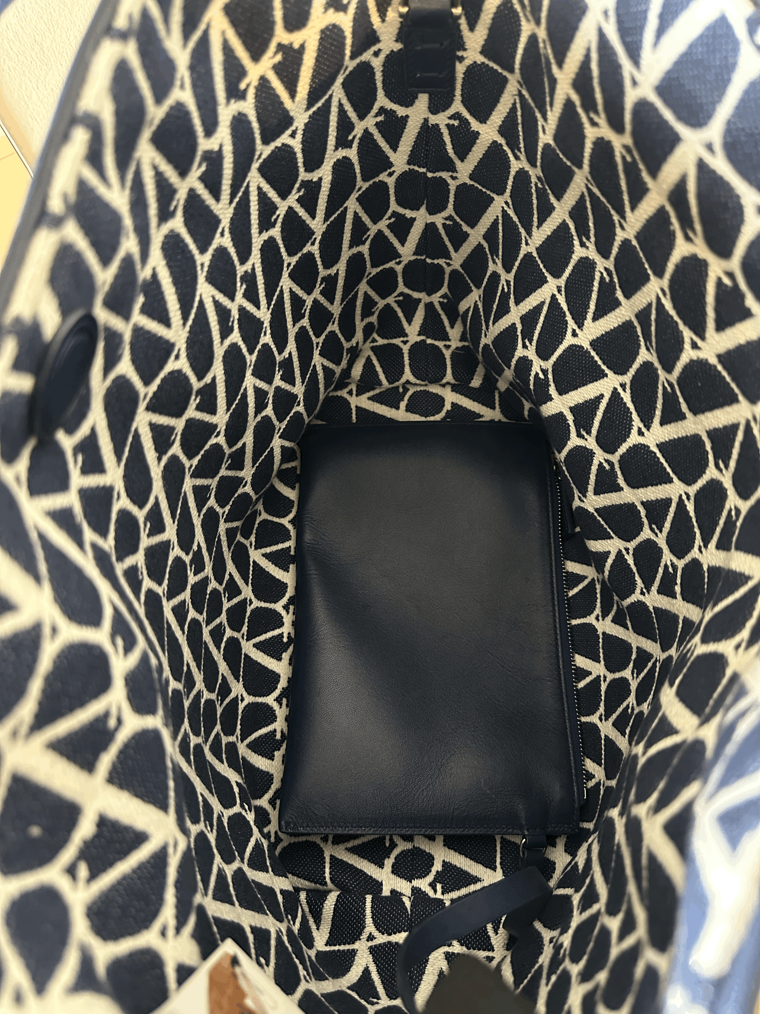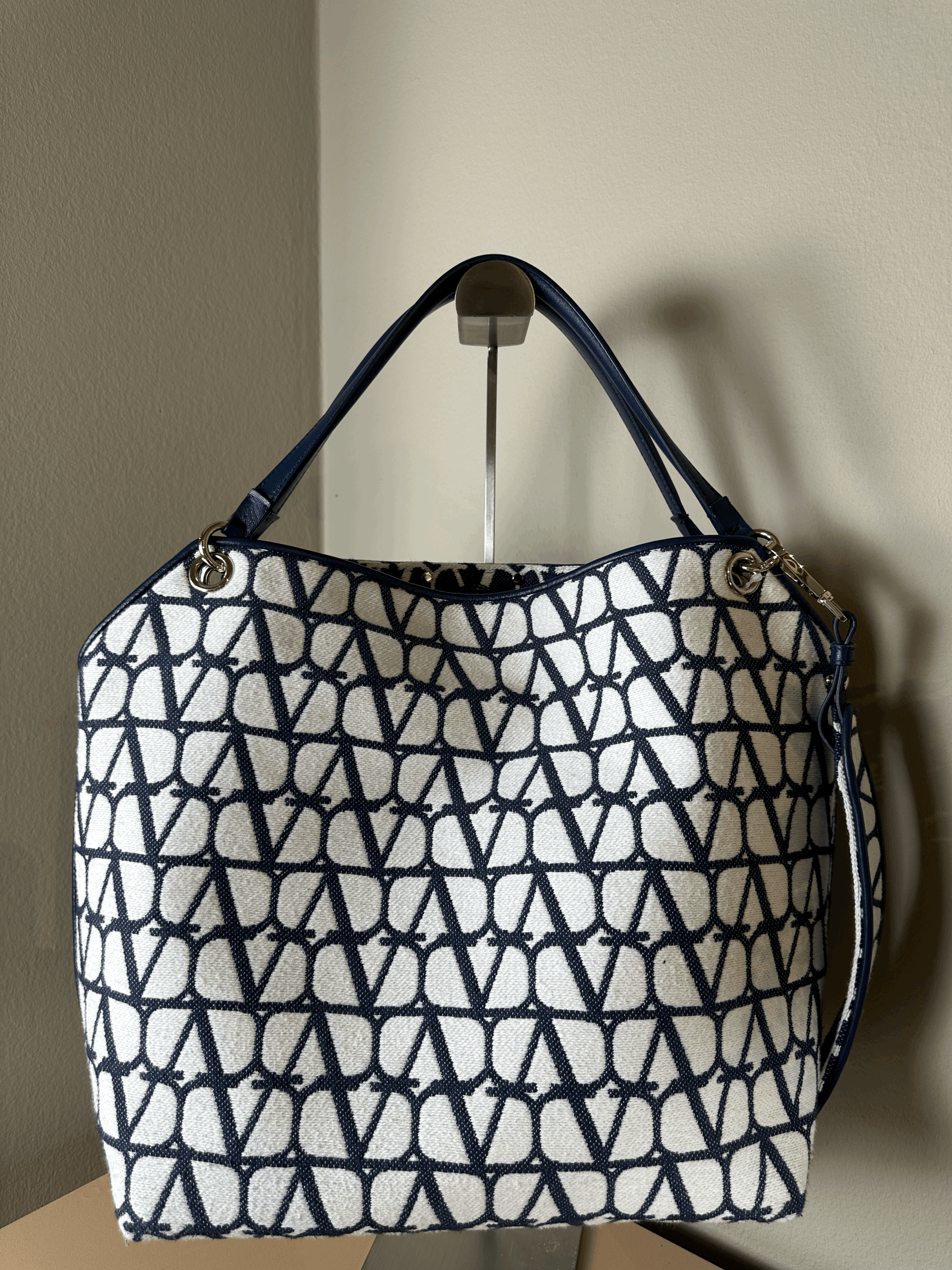 This Valentino Garavani tote is crafted from structured jacquard canvas featuring an all-over VLogo pattern in navy and white. The design is elevated with navy leather trim and silver-tone hardware, including a prominent V-Logo metal plaque at the front. The dual leather top handles and wide shoulder strap offer versatile styling for shoulder or hand carry.