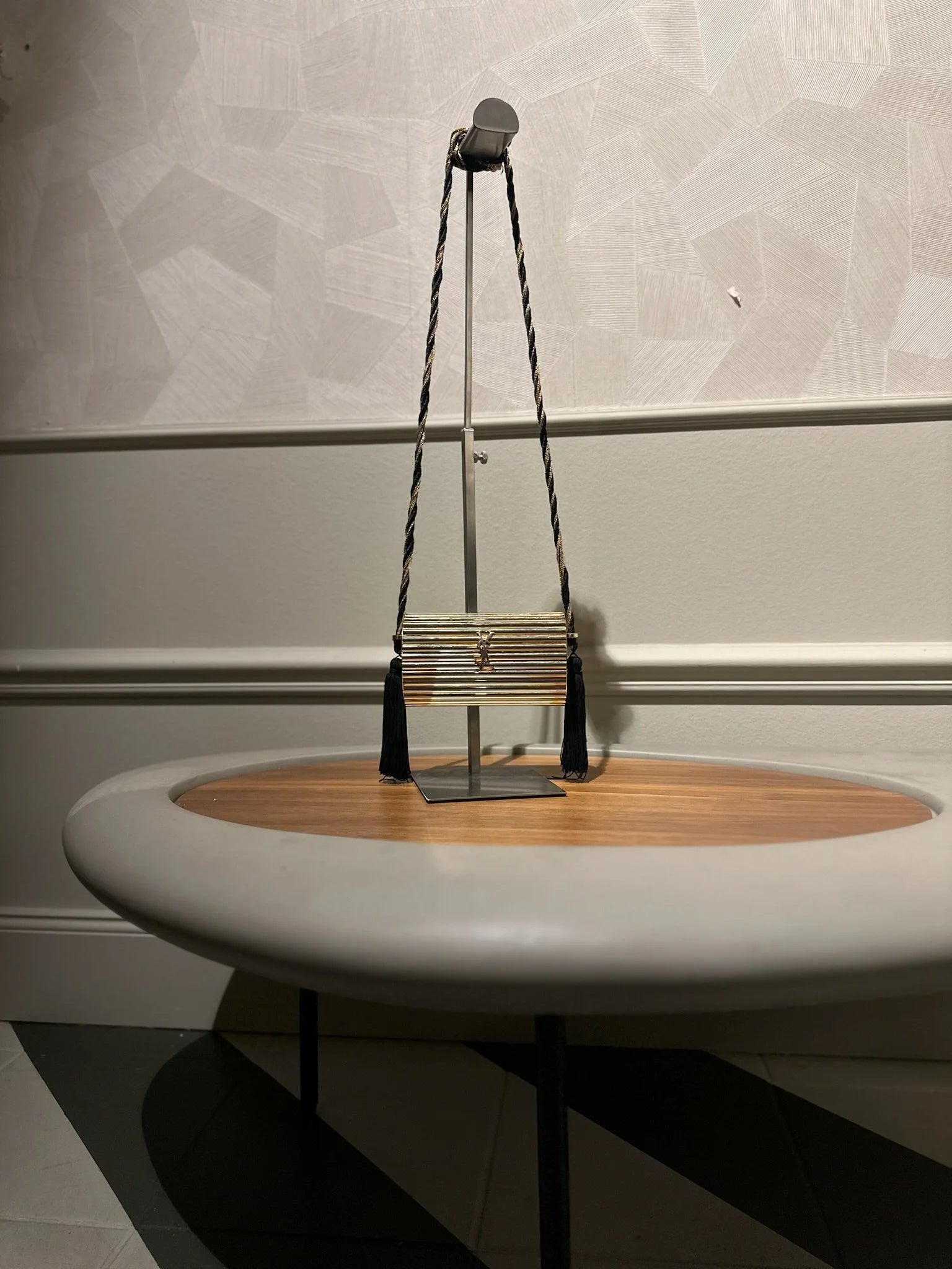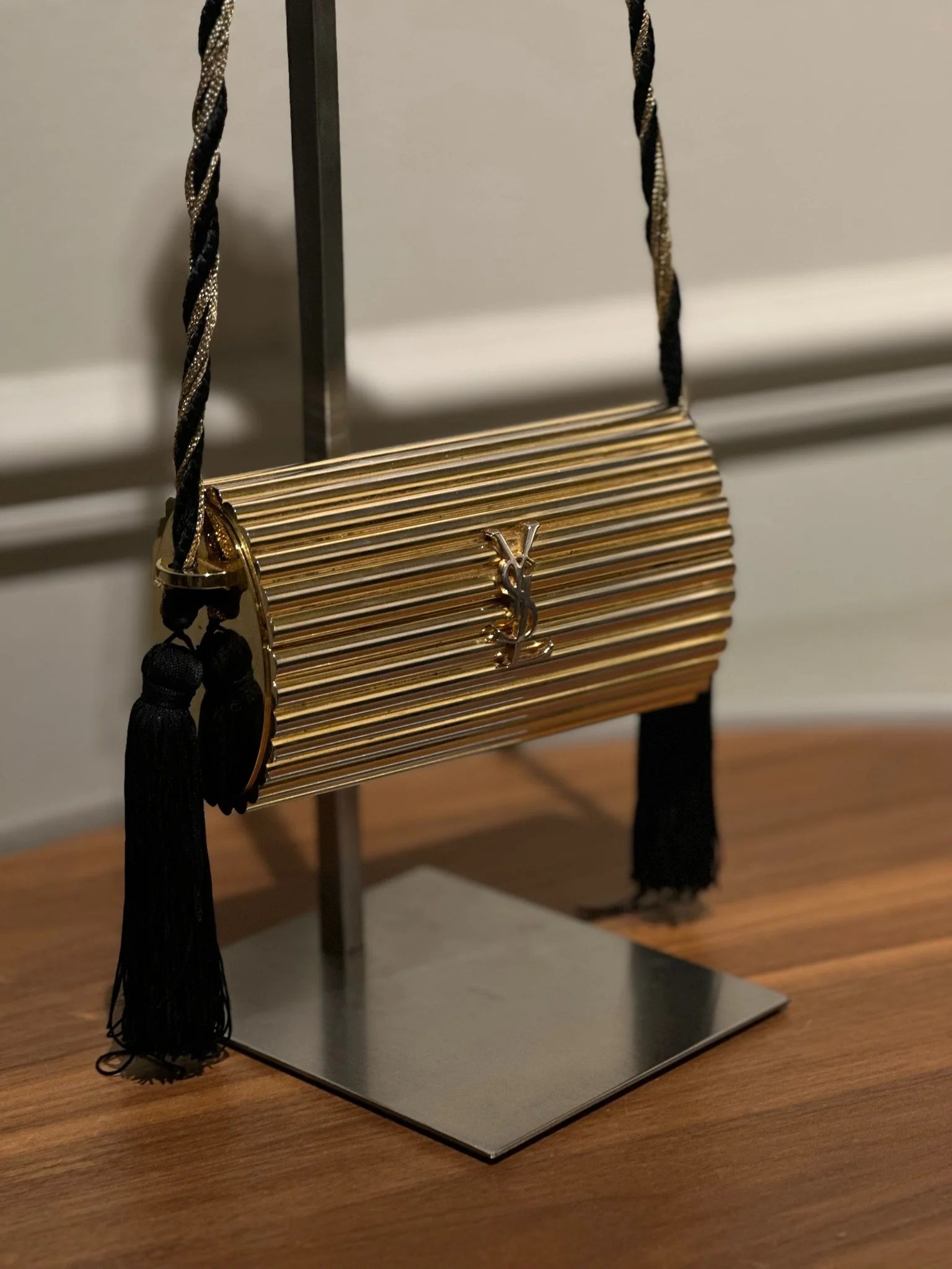 This Yves Saint Laurent Opium clutch bag features a distinctive cylindrical design with a structured, ribbed gold-tone metal exterior. The front displays the recognizable YSL logo. The bag is complemented by black fabric tassels on each side, adding to its unique style. It comes with a shoulder strap, which shows visible damage. However, the wear on the strap is not easily noticeable when the bag is carried.