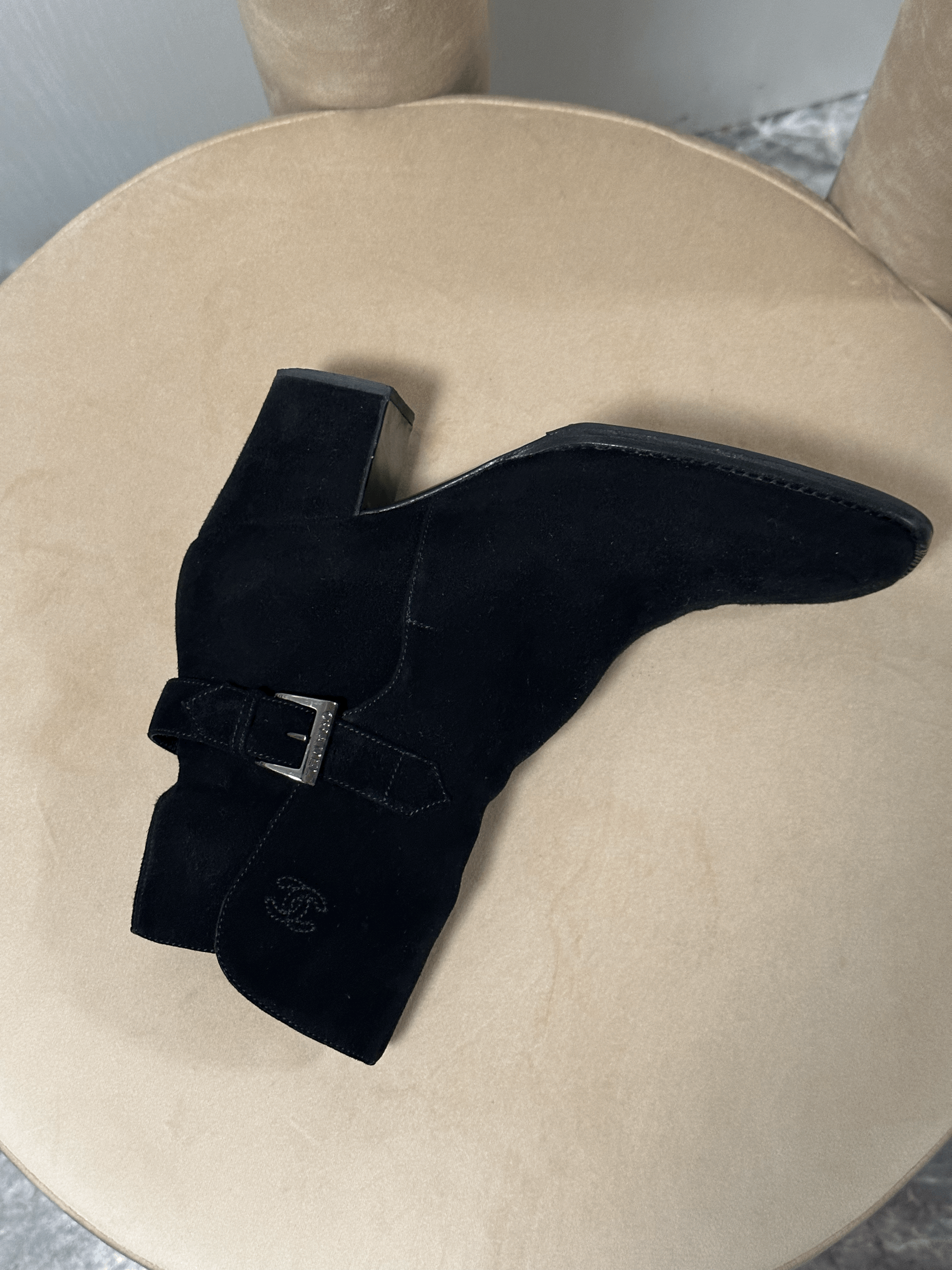 Black suede Chanel boots with box. The shoes have a CC logo detail on the side.