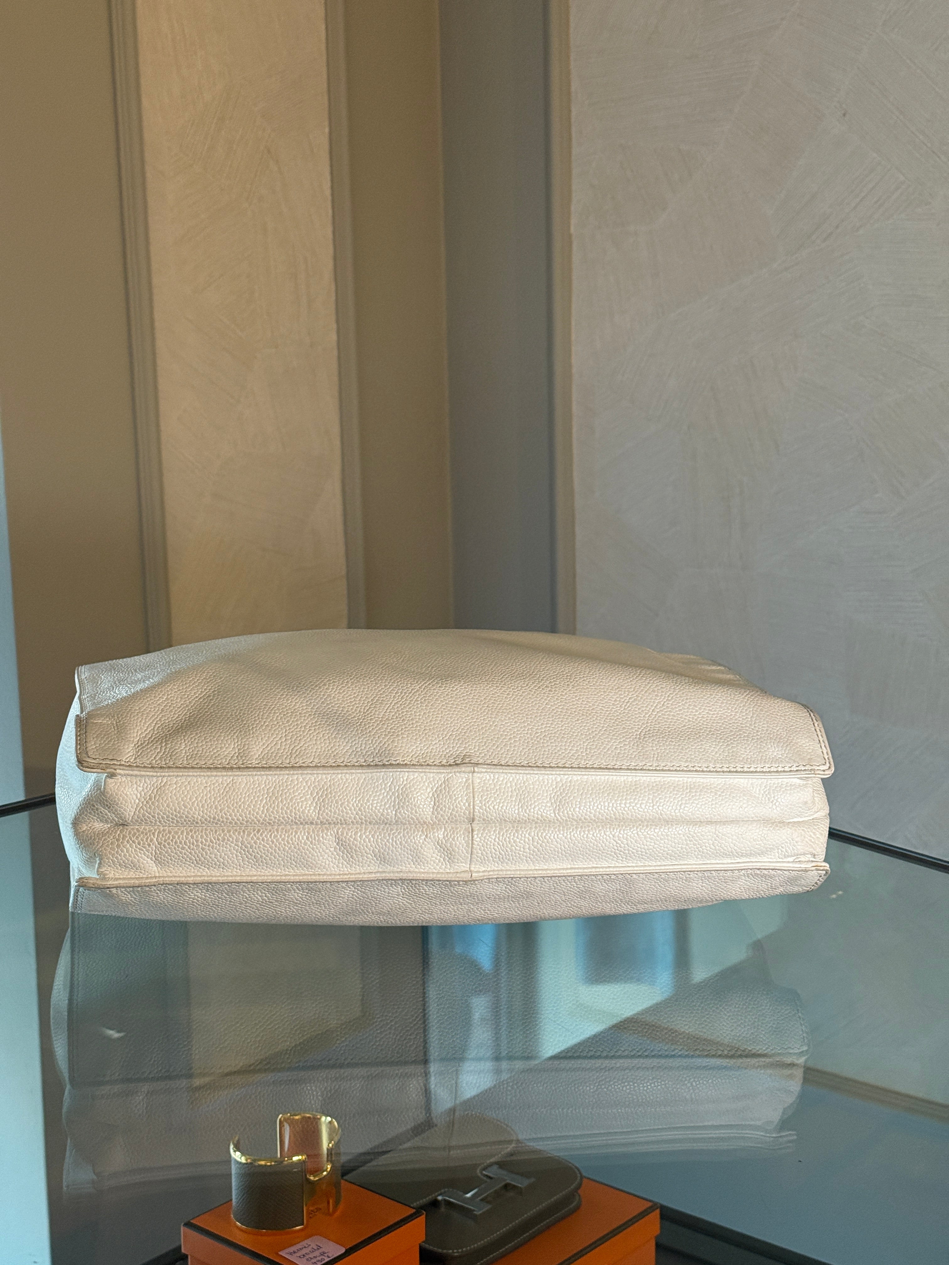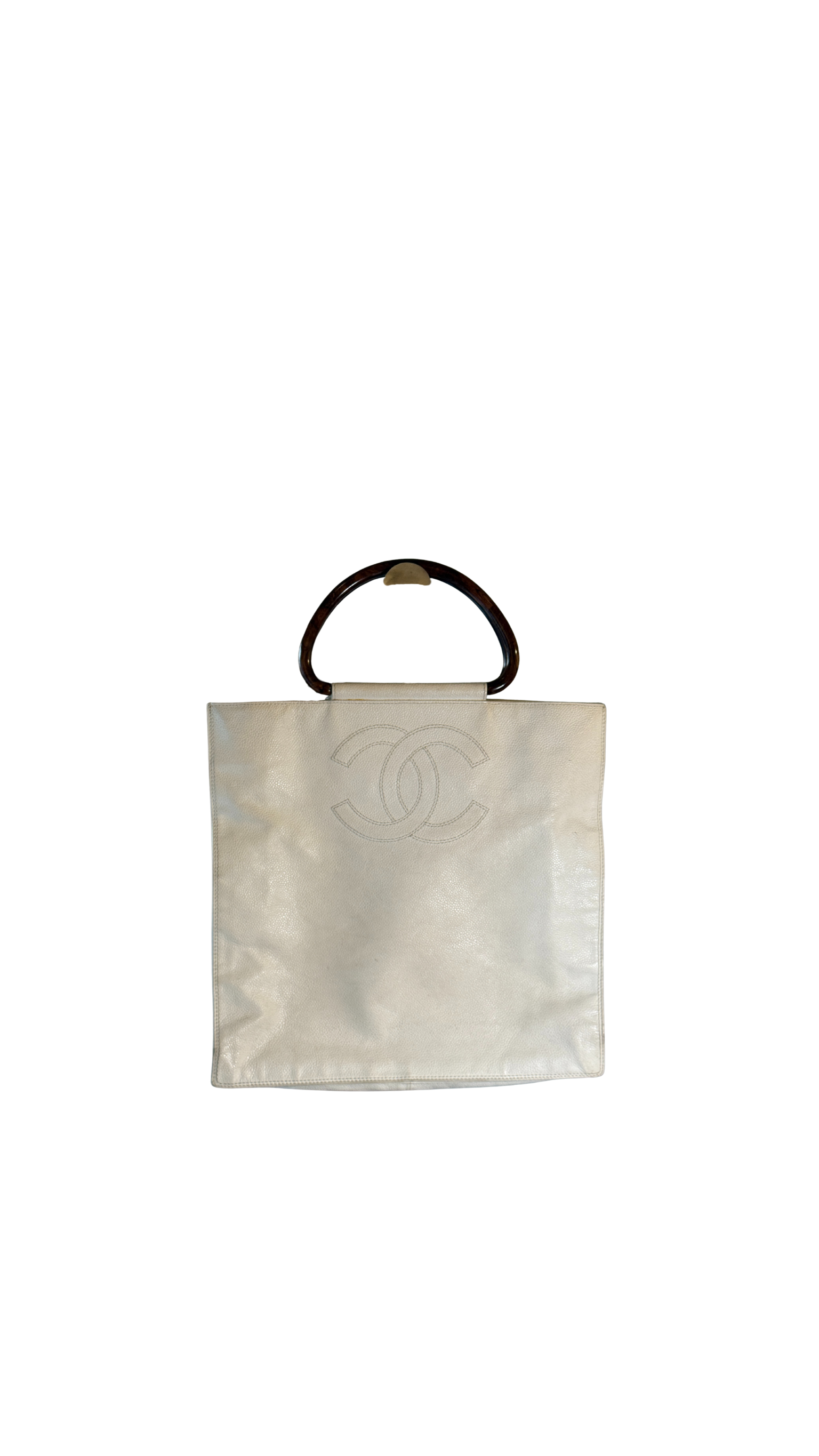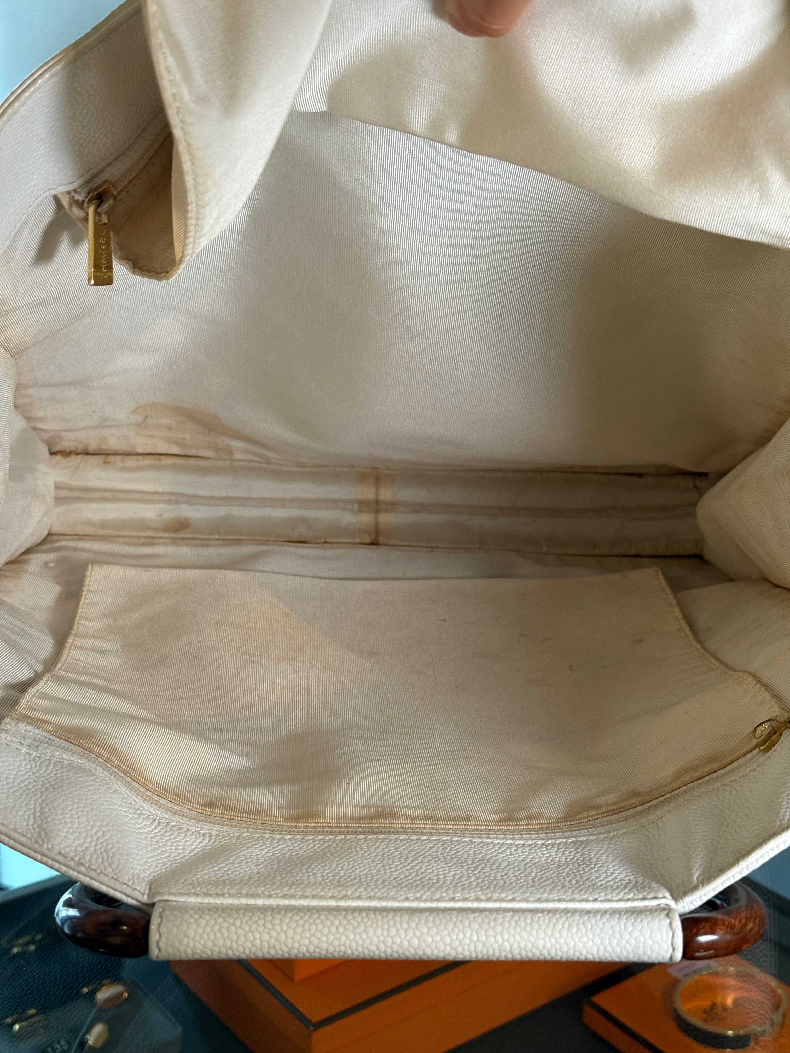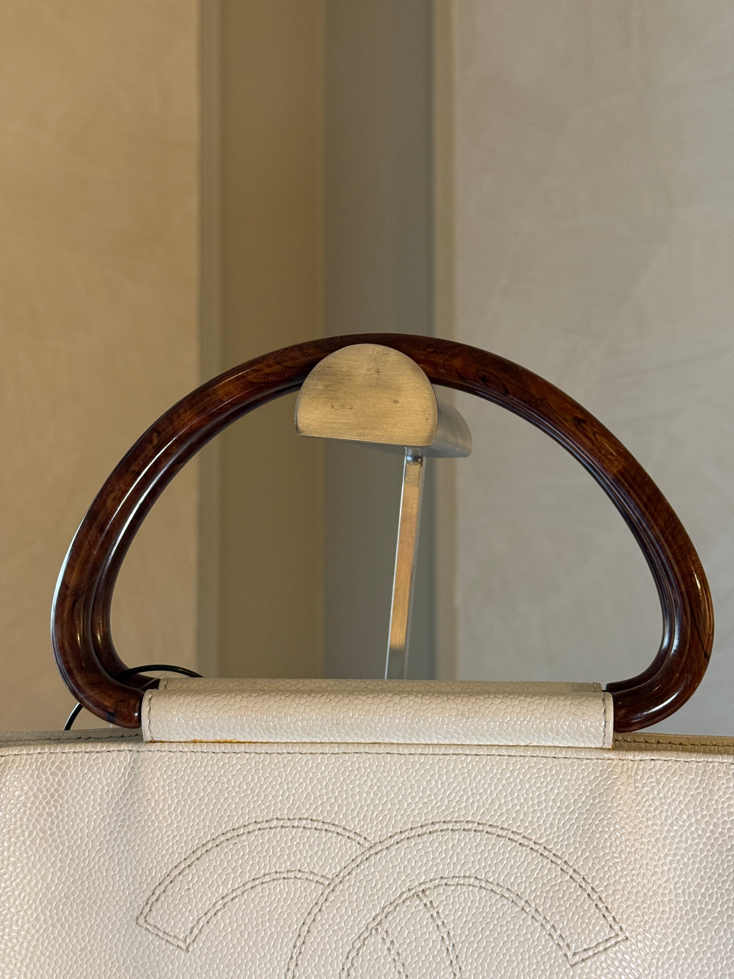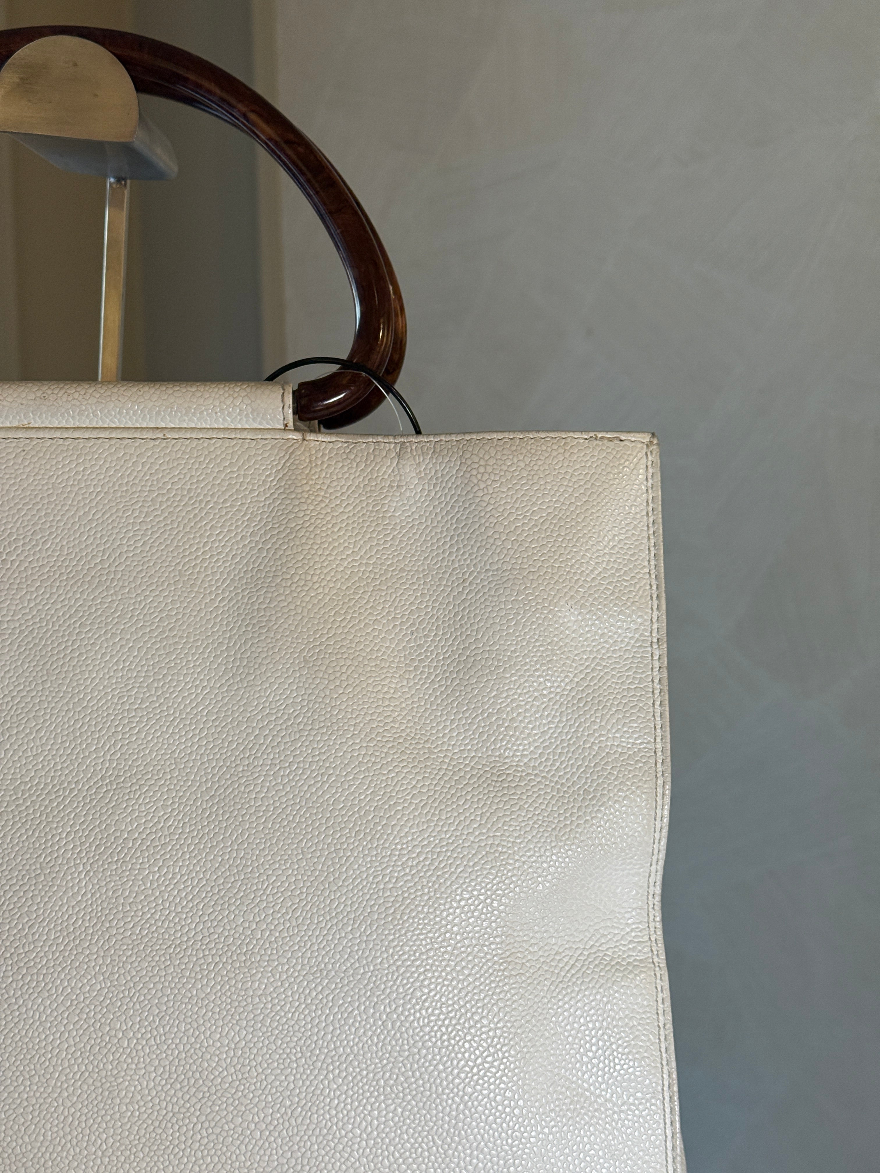 This elegant Chanel Hobo Bag is crafted from high-quality white leather, featuring a spacious silhouette and luxurious wooden handles that add a unique, natural touch.