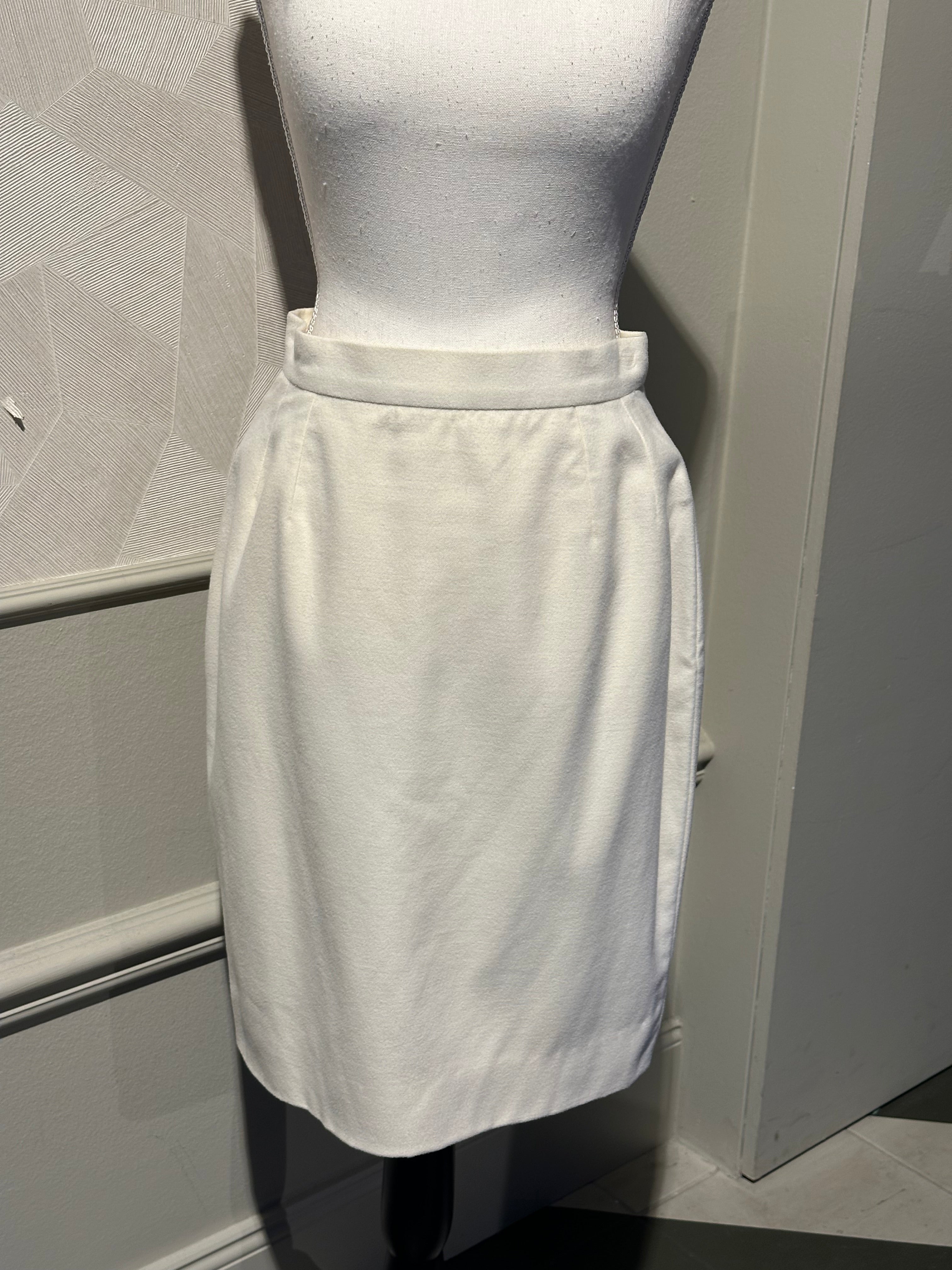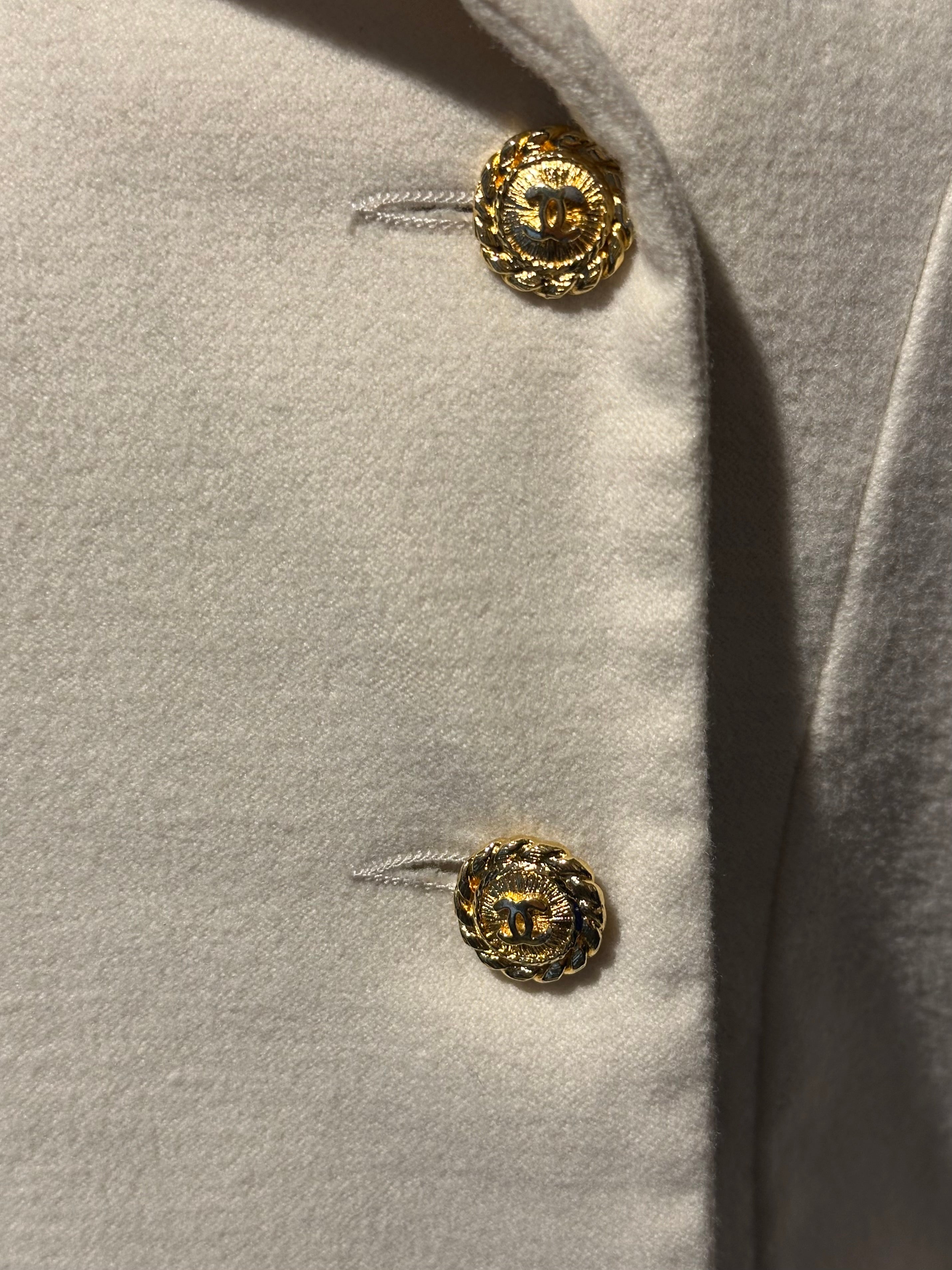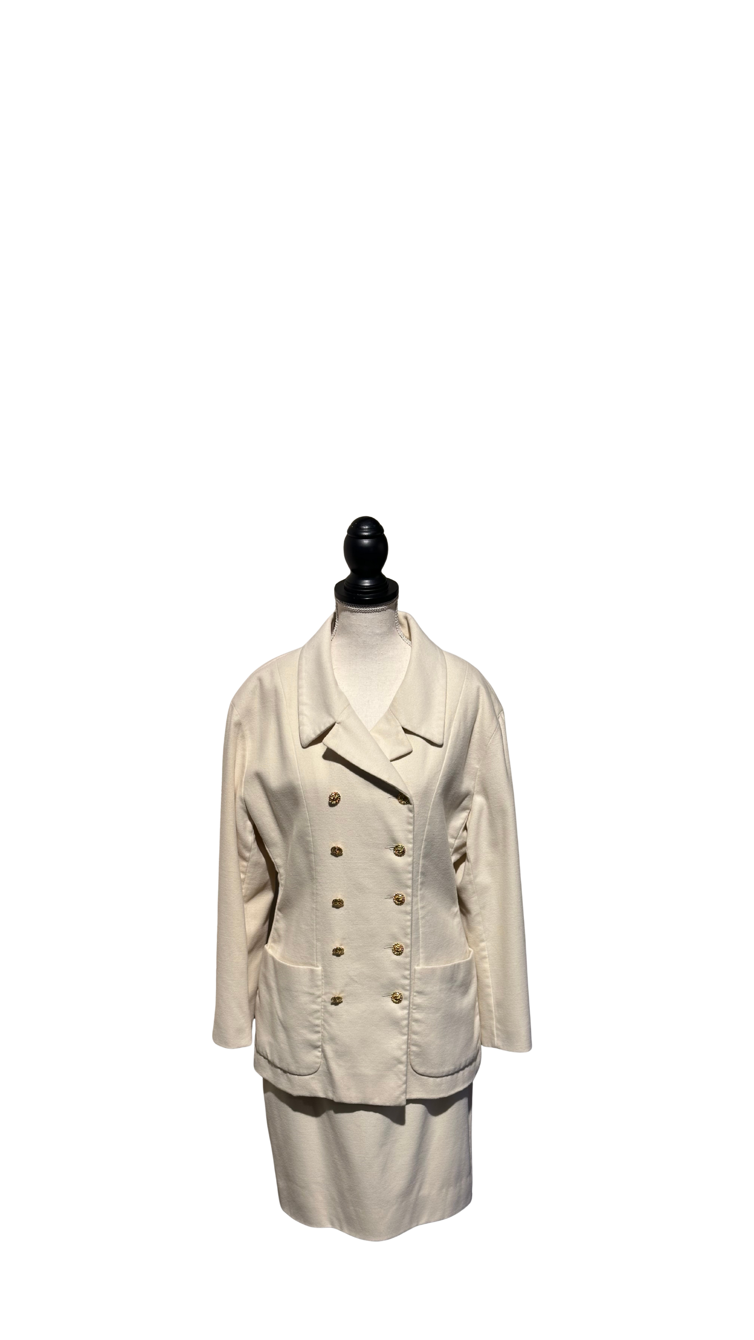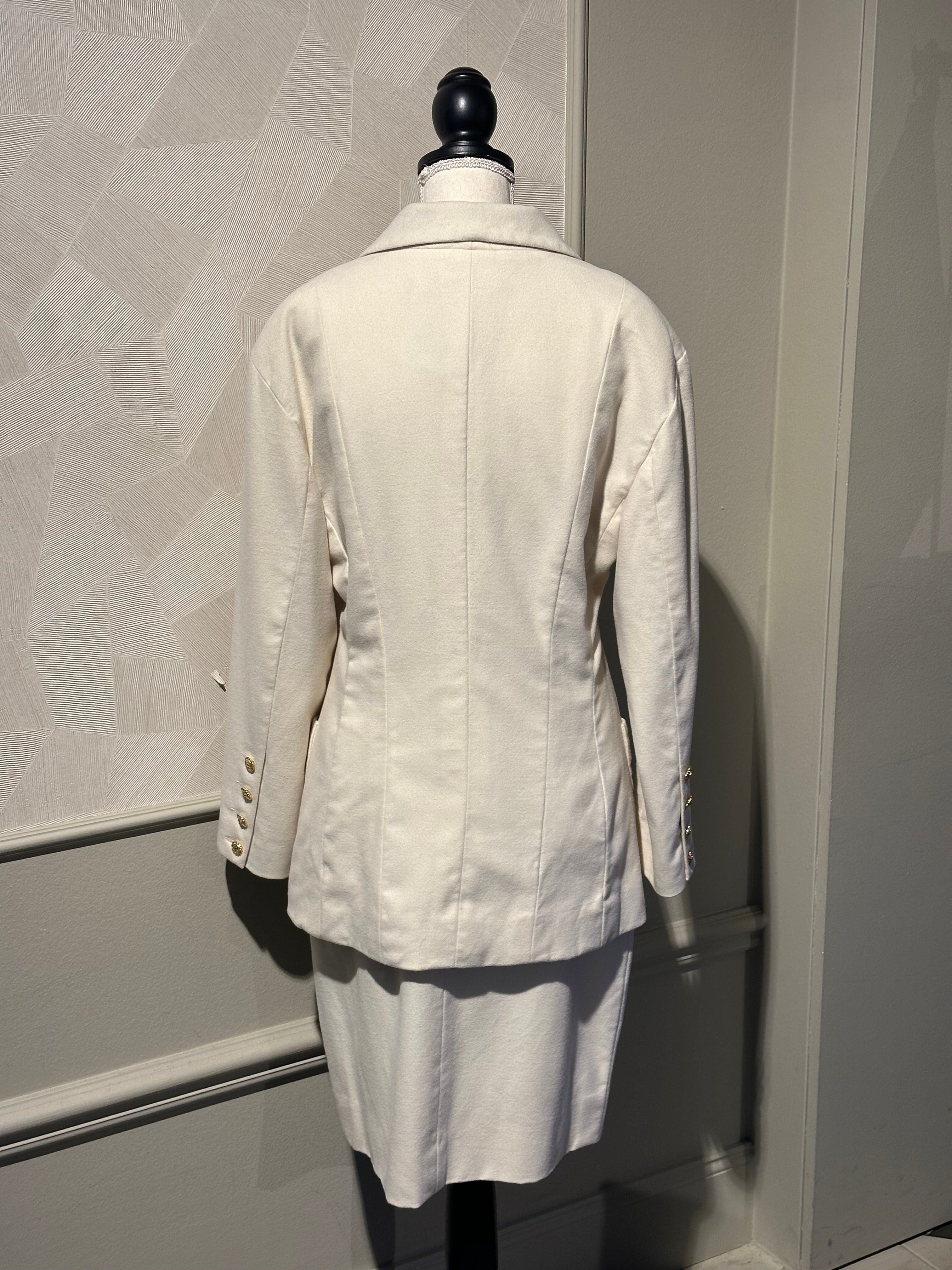 This elegant Chanel two-piece set is crafted from classic white tweed and features a tailored blazer paired with a matching skirt.