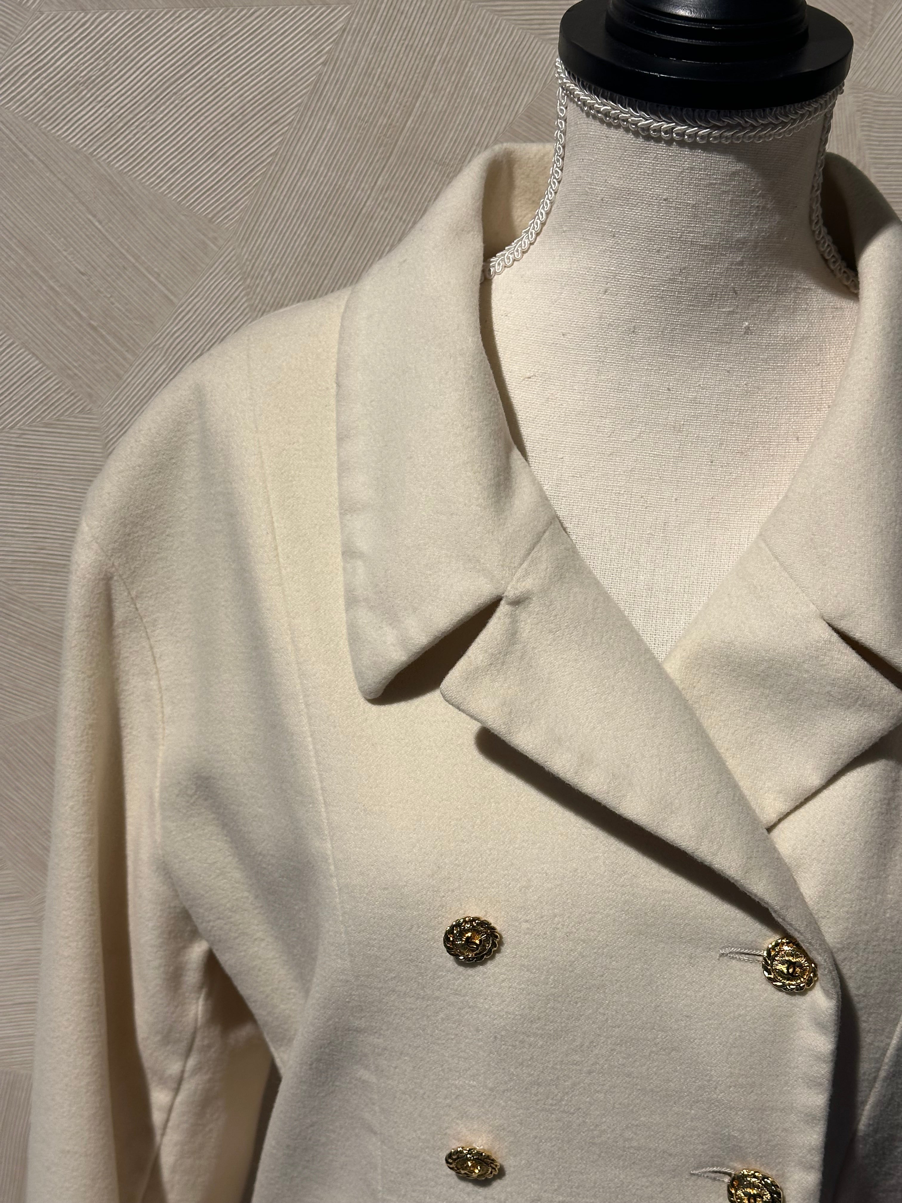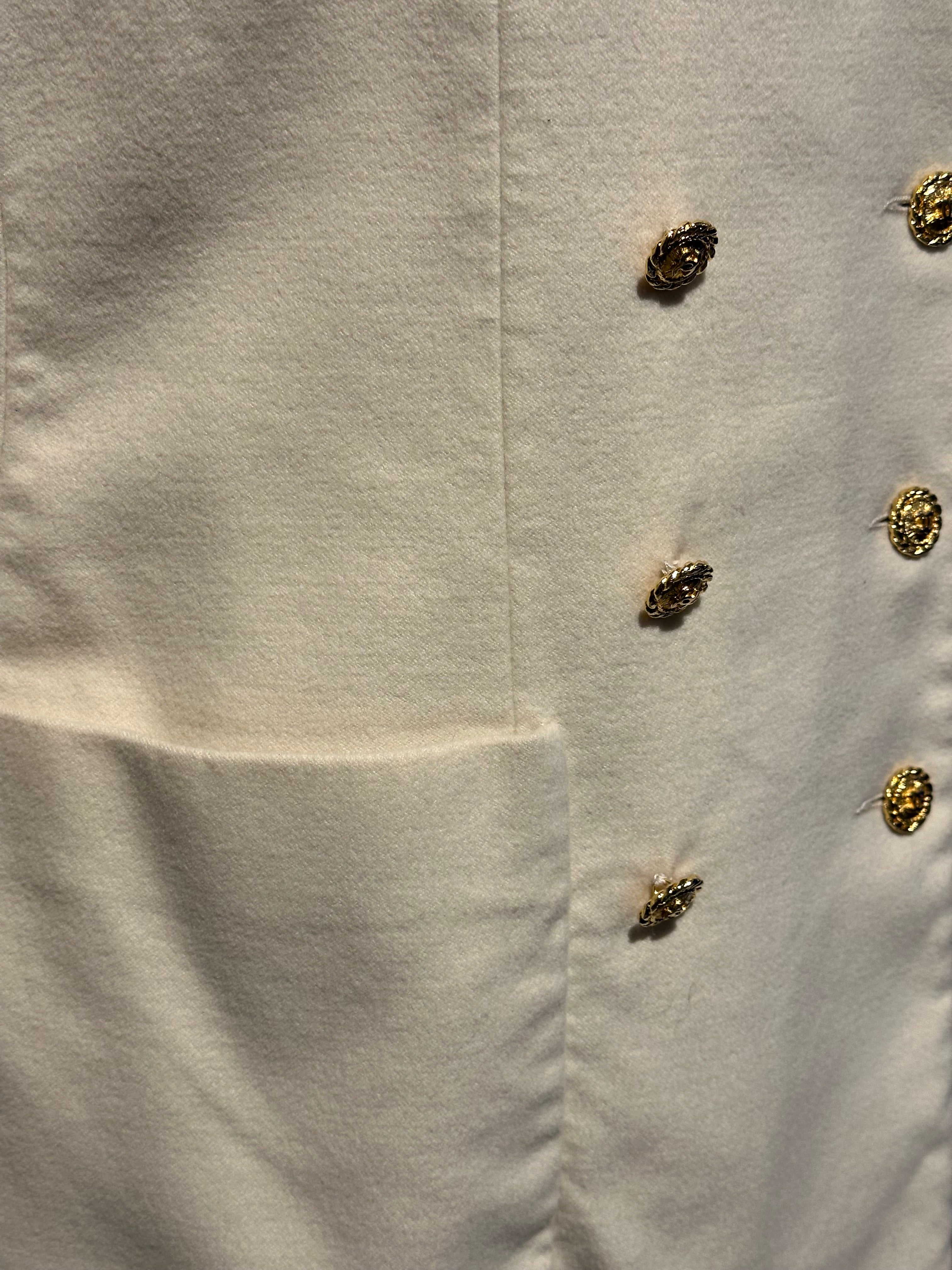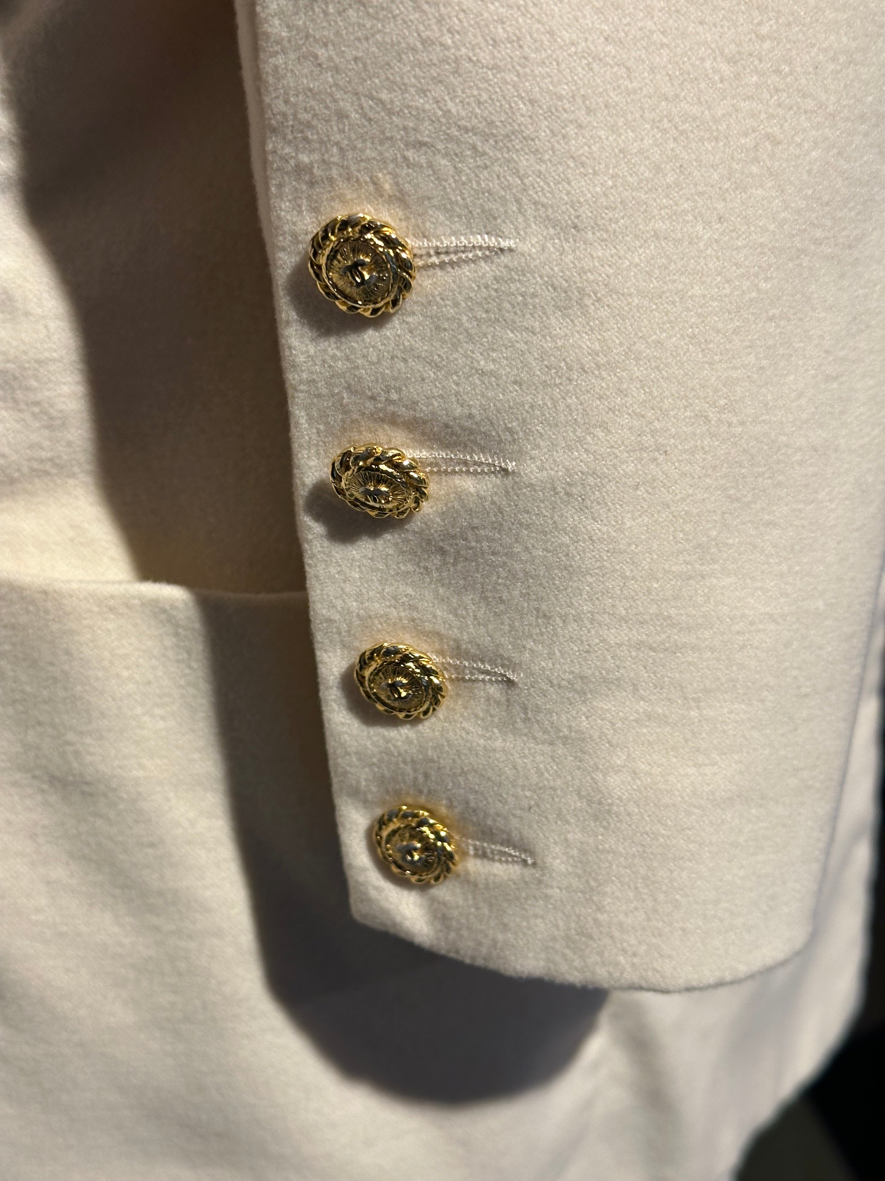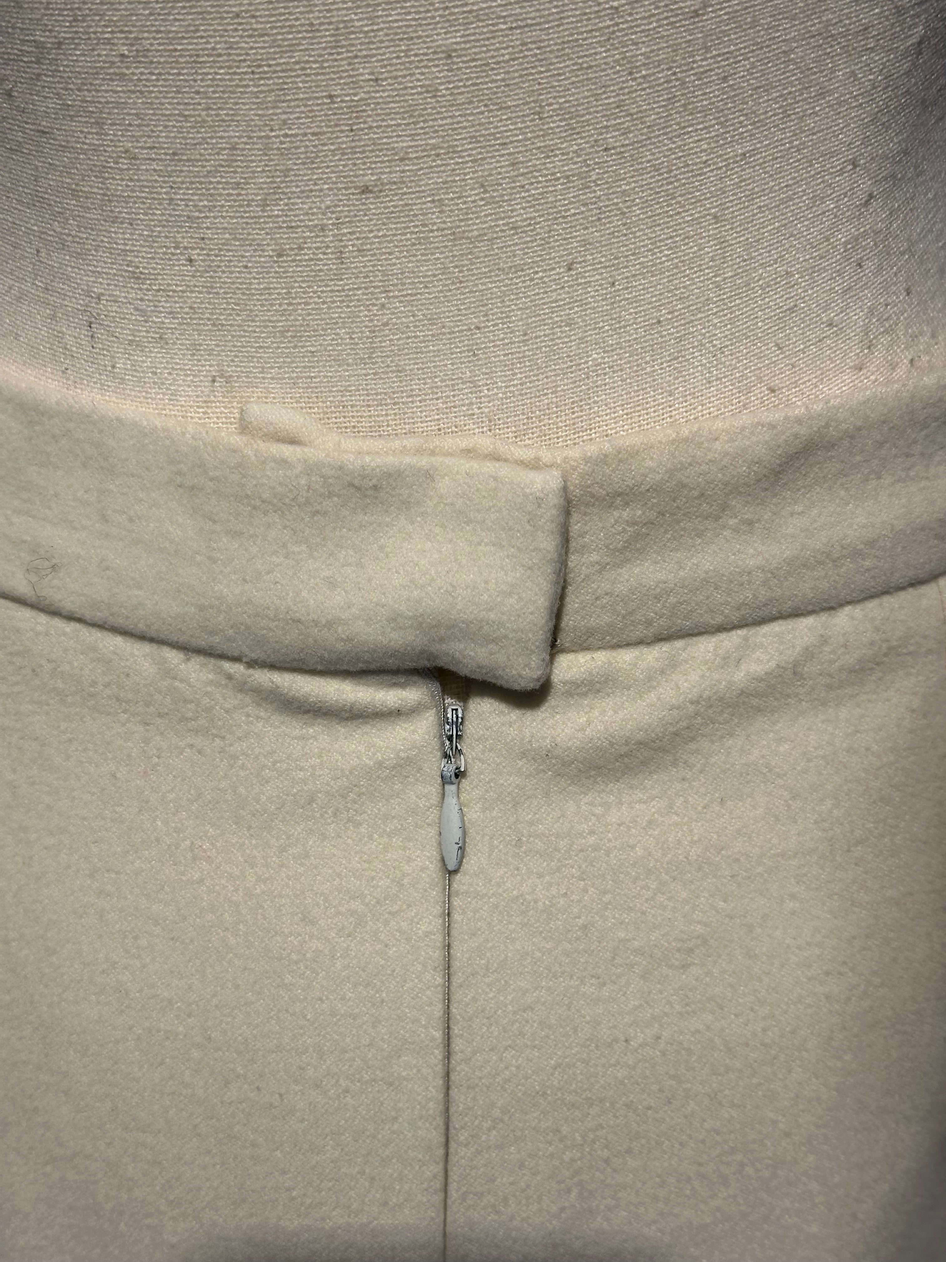 This elegant Chanel two-piece set is crafted from classic white tweed and features a tailored blazer paired with a matching skirt.