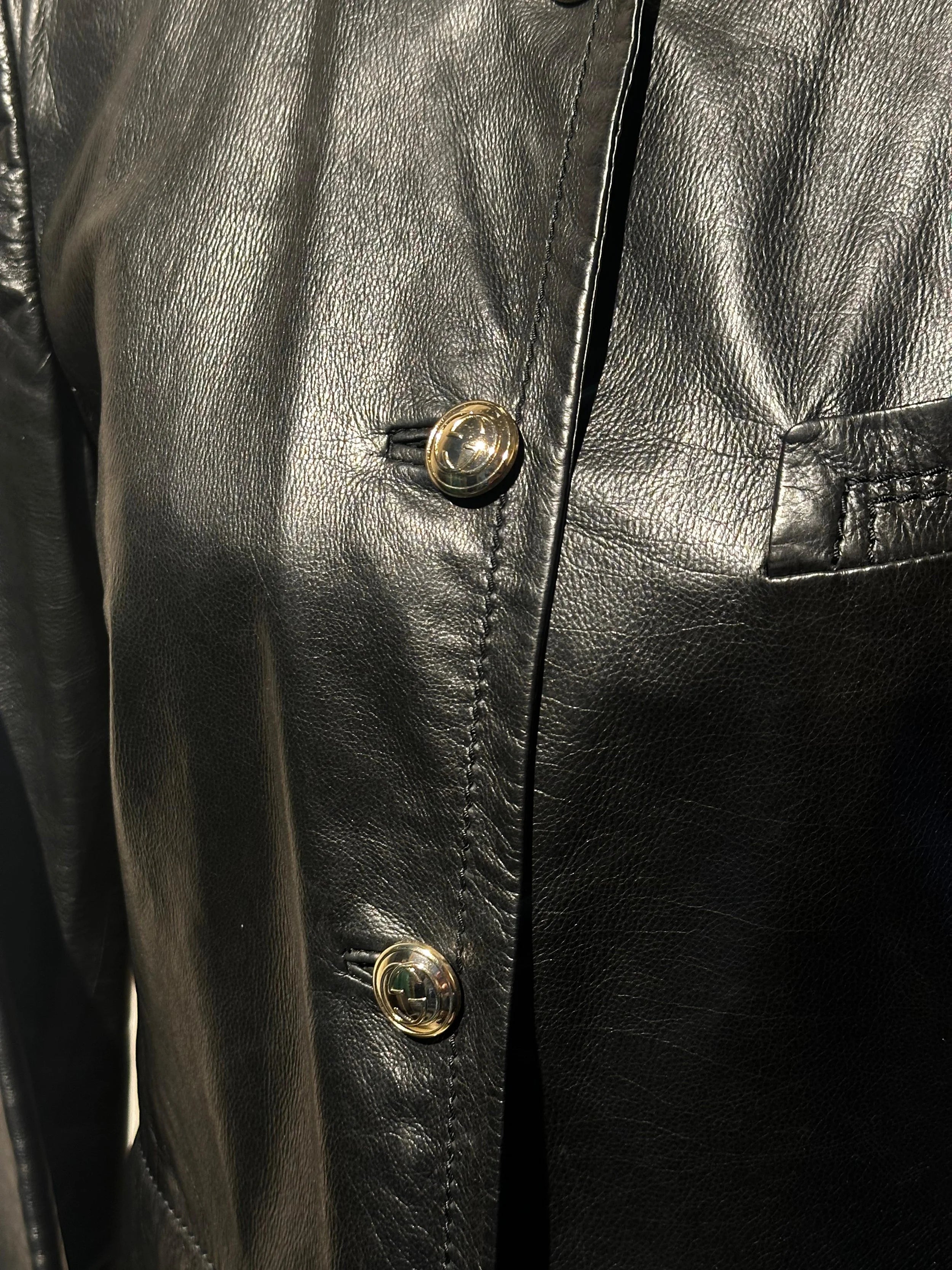 This Gucci leather jacket is crafted from sleek black leather and elevated with a striking detail on the back. The design combines the timeless edge of a classic leather jacket with Gucci’s signature flair for bold embellishment, making it a true statement piece.