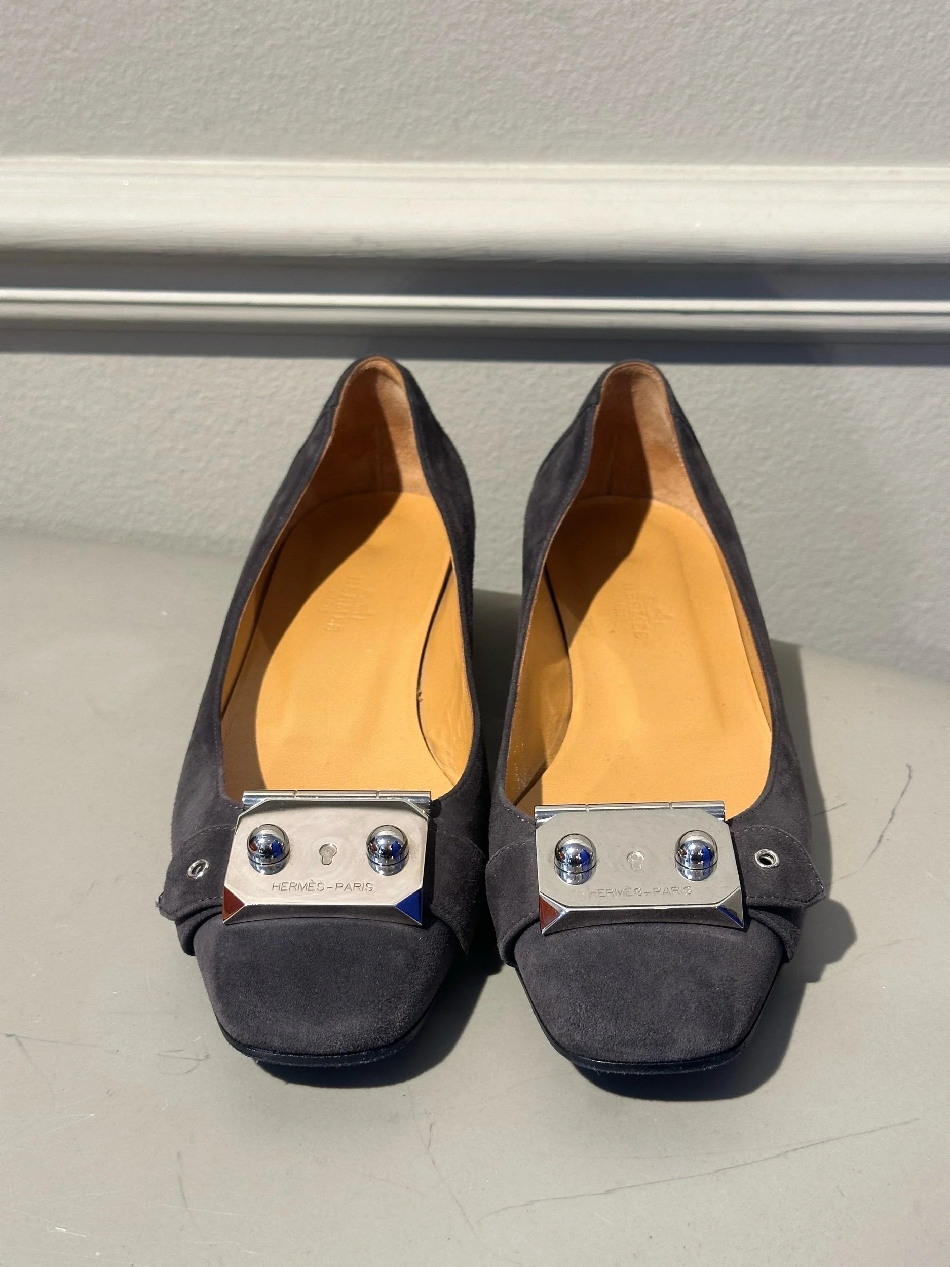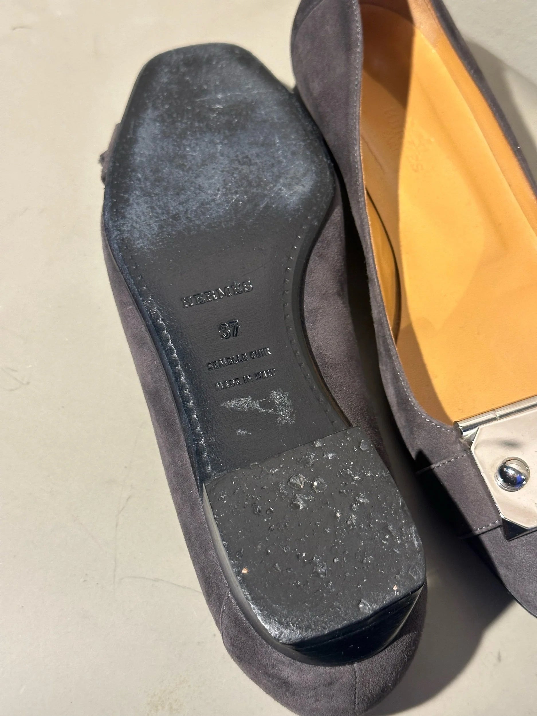 Hermès Flats – Grey Suede with Palladium Plate, Size 37