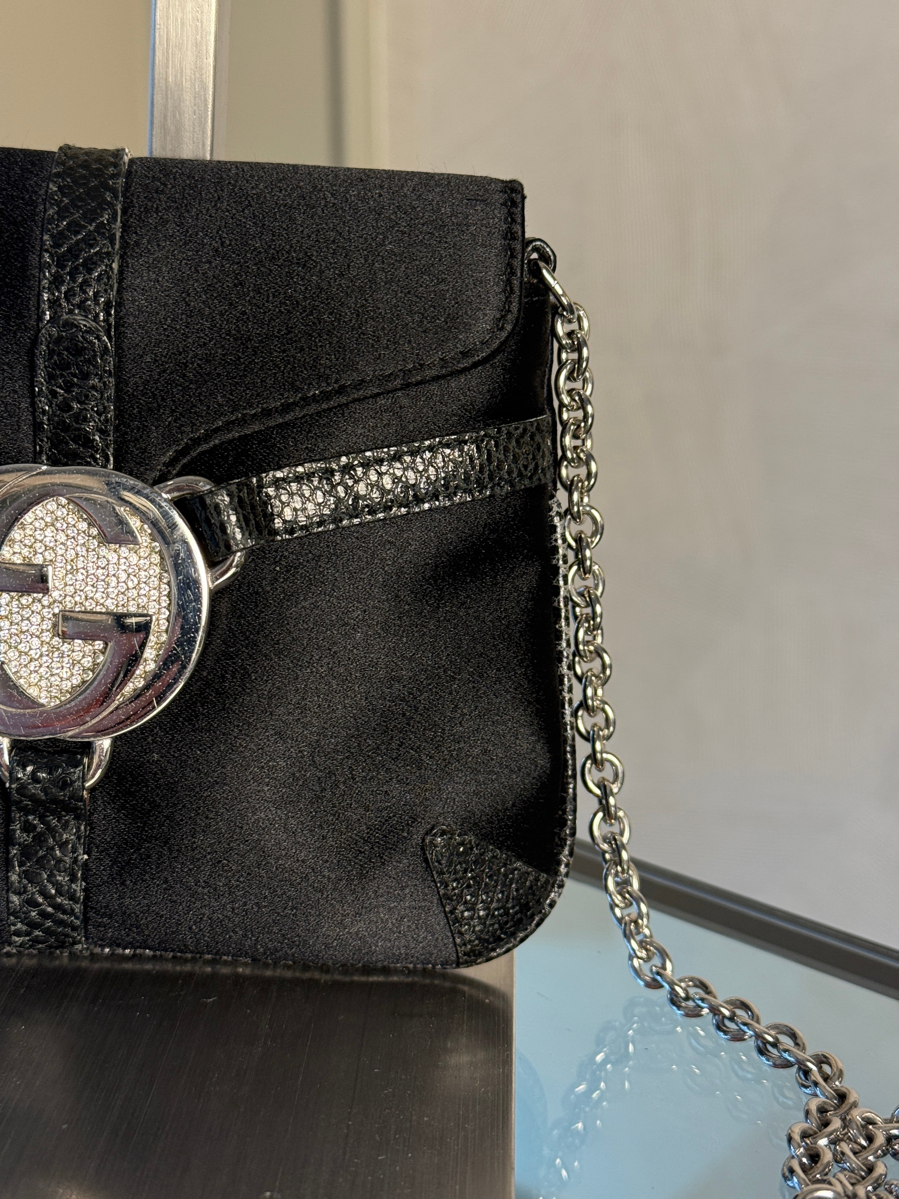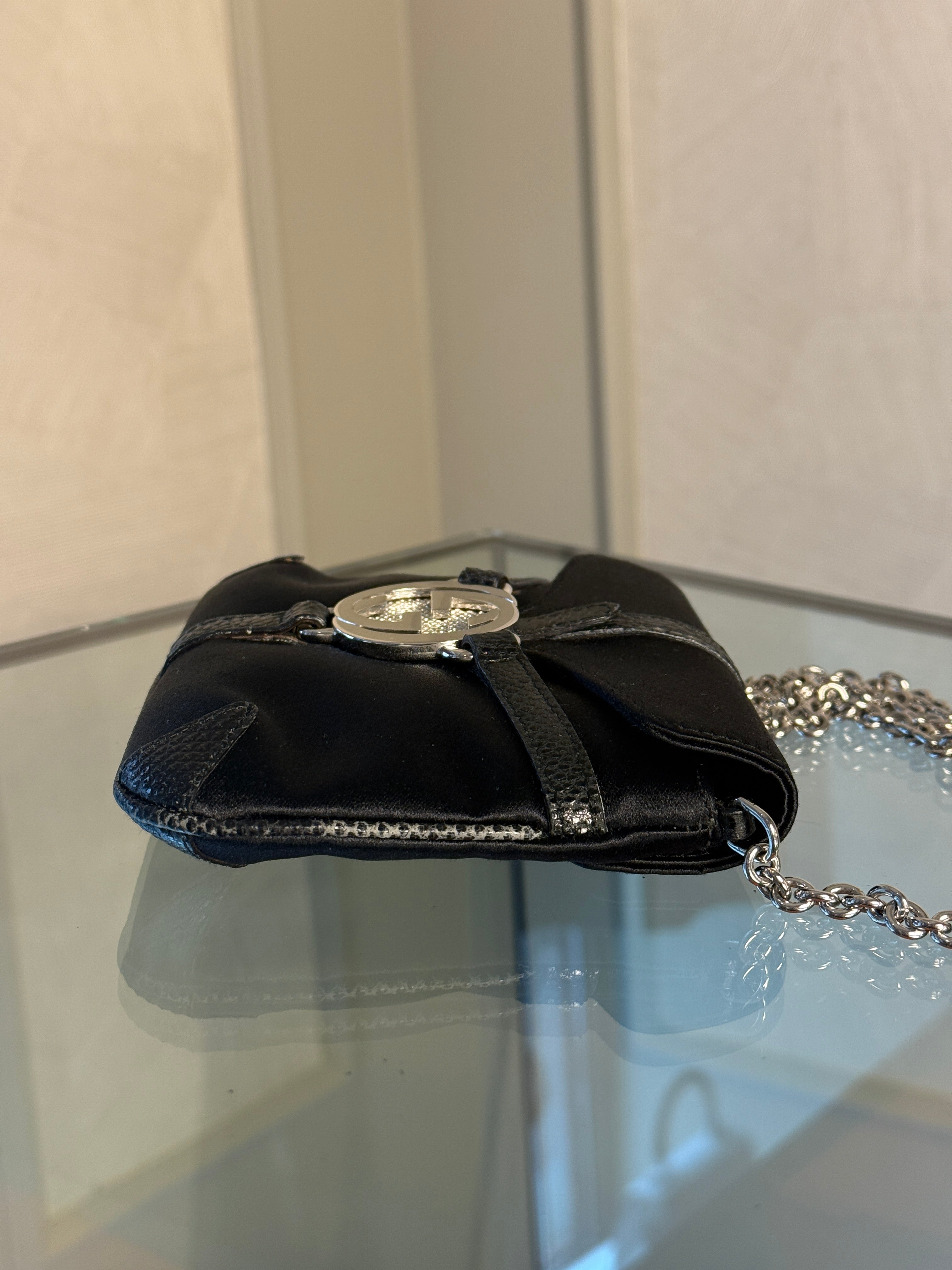 This elegant Gucci mini bag is crafted from lustrous black silk with tonal leather trim and features a distinctive silver-tone GG logo clasp. The design is compact yet structured, perfect for evening wear or formal occasions. A fine chain strap adds a modern touch, allowing it to be worn over the shoulder or as a crossbody. Sleek and timeless, this piece captures Gucci’s refined style during the Tom Ford era.